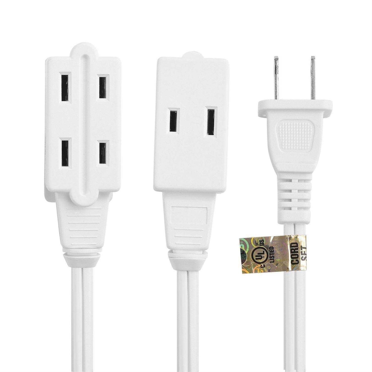 Indoor extension cord extends the length of a two prong power cable; The white extension cord is rated for Indoor use with equipment such as a lamp, mobile device charger, TV, small electronics or other device with a 2 prong power cord; Polarized power extension cord can be plugged into a standard 3-prong 120V AC outlet receptacle. 16 AWG gauge power cord extension is rated for up to 13 amps / 1625 watts to support common voltage power requirements in the home or office; Extend a short lamp cord to an outlet behind furniture or connect temporary holiday lights with these extension cords. Flexible & flat electric cord with an SPT-2 cord is safer and more reliable at longer distances than thinner a 18 AWG two prong extension cord; Travel friendly, lightweight slim extension cord is easy to carry along to an RV or hotel room with limited electrical outlets; Fully molded strain relief connectors provide long life and durability. Safe & reliable flat extension cord with a NEMA 1-15P polarized power plug and 3 NEMA 1-15R polarized receptacles; Rated for 13 Amps/1625 Watts to easily extend a TV power cord from an HDTV; Removable tamper guard plugs into one side of the extension cord when not in use. Universal 2-prong compatibility with most common household small appliances and consumer electronics with 2 prong cords.,,Cable Matters