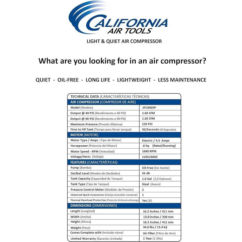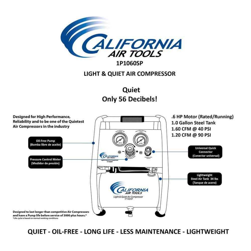 The California Air Tools light and quiet 1P1060SP portable air compressor is designed to be one of the quietest air compressors in the industry at only 56 db of sound. The 1.2 HP motor operates at only 1680 RPM, creating less noise and less wear. The updated in.Ip in. Ultra Quiet and oil-free motor is a single Piston pump design engineered for high performance and durability. The 1.0 GAL. Steel Air tank is lightweight (34 lbs.), making it very easy to transport. This compressor has an oil-free single Piston pump designed to have a life cycle before wear of 3000 Plus hours compared to other comparable air compressors with life cycles of 250 hours or less. The oil-free pump allows for use in a variety of different temperatures (cold) and uneven terrains. The 1P1060SP produces 1.2 CFM at 90 PSI, allowing you to use staple guns, brad nail guns, finish Nail guns, nail guns, airbrushes and blow guns. It’s great for the garage and perfect for cleaning or inflating tires, beds, toys and sport balls. Its quiet design is ideal for anyone working inside where noise is a major issue.