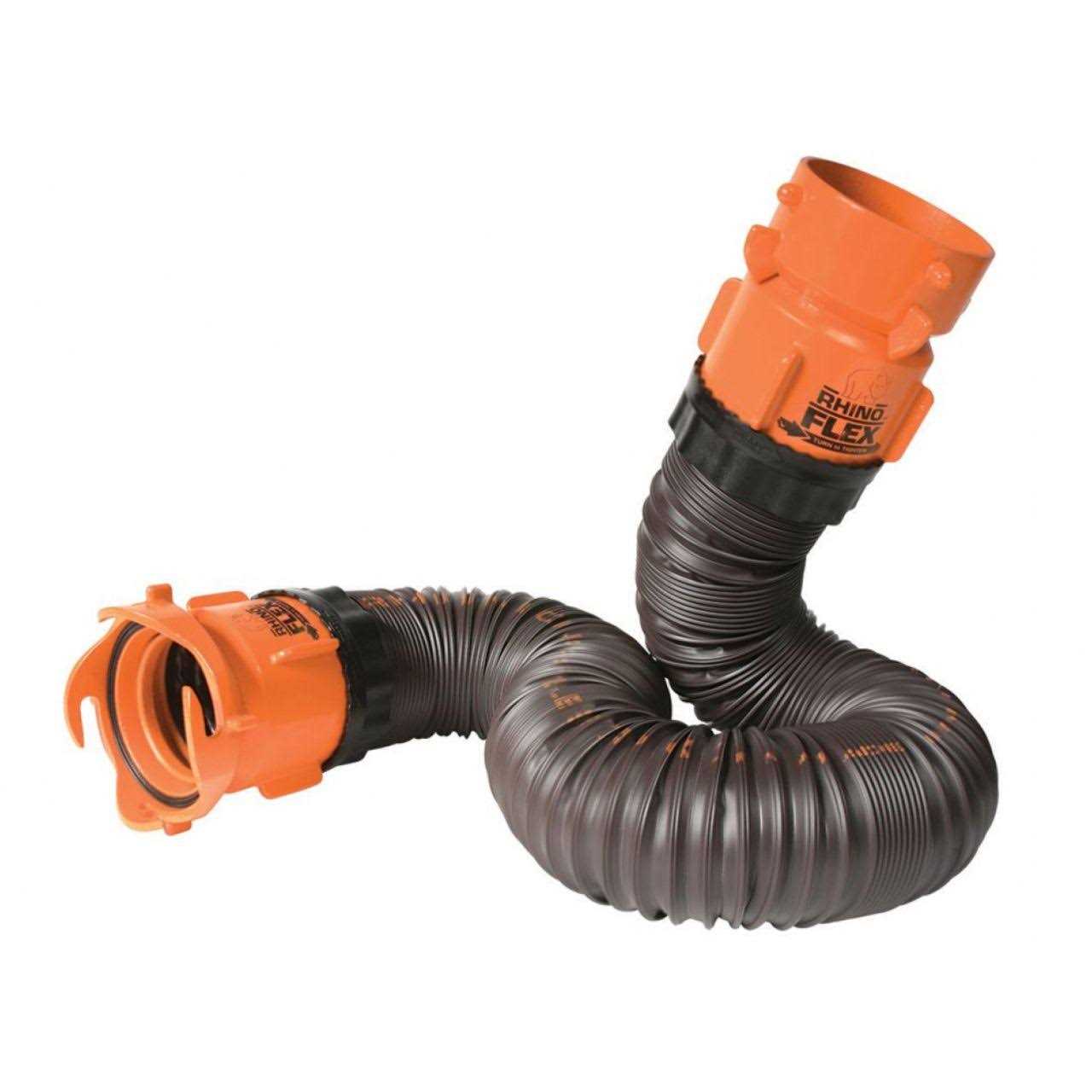 - Kit includes 5′ RhinoFLEX sewer hose, swivel bayonet fitting, swivel lug fitting and two locking rings