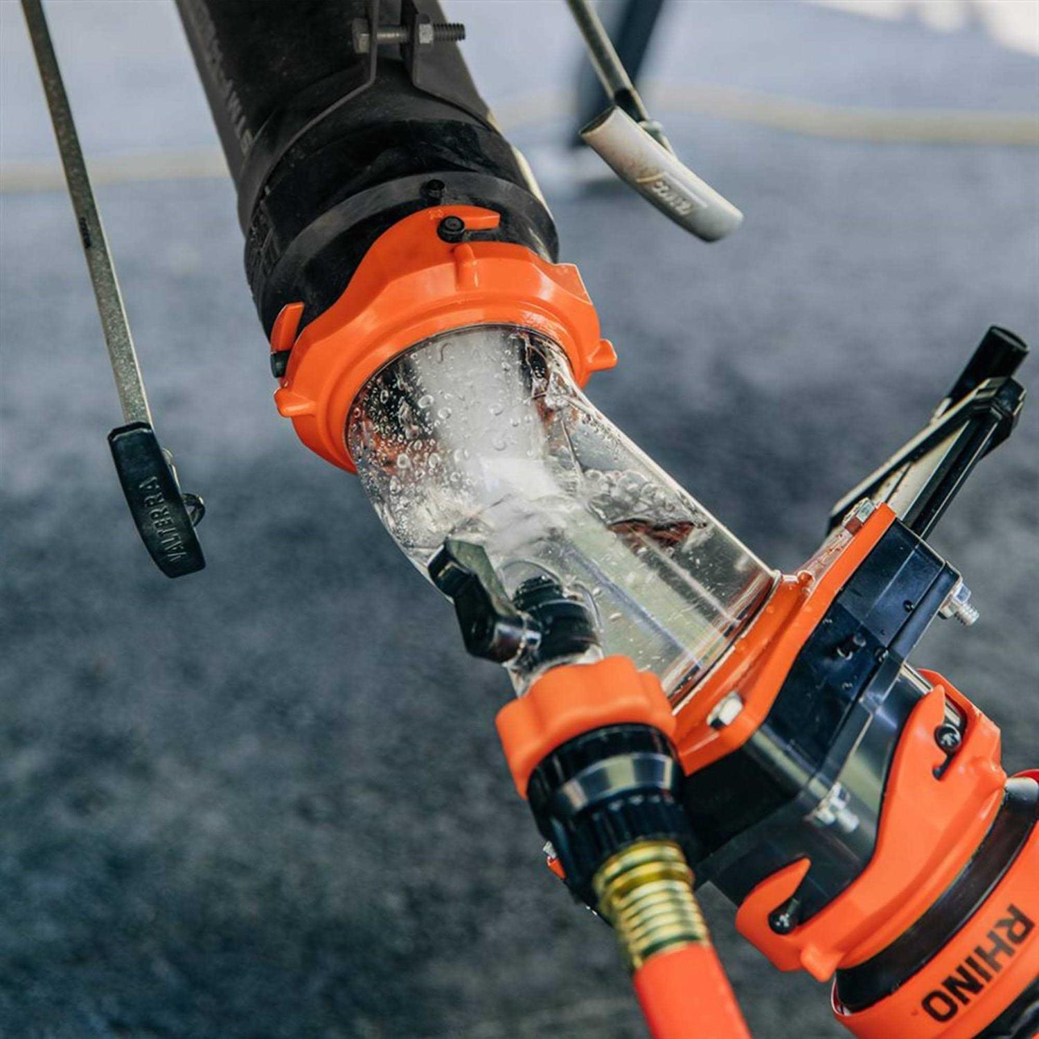 - Rhino Blaster Pro Tank Rinser securely attached to RV sewer outlet via bayonet swivel fitting