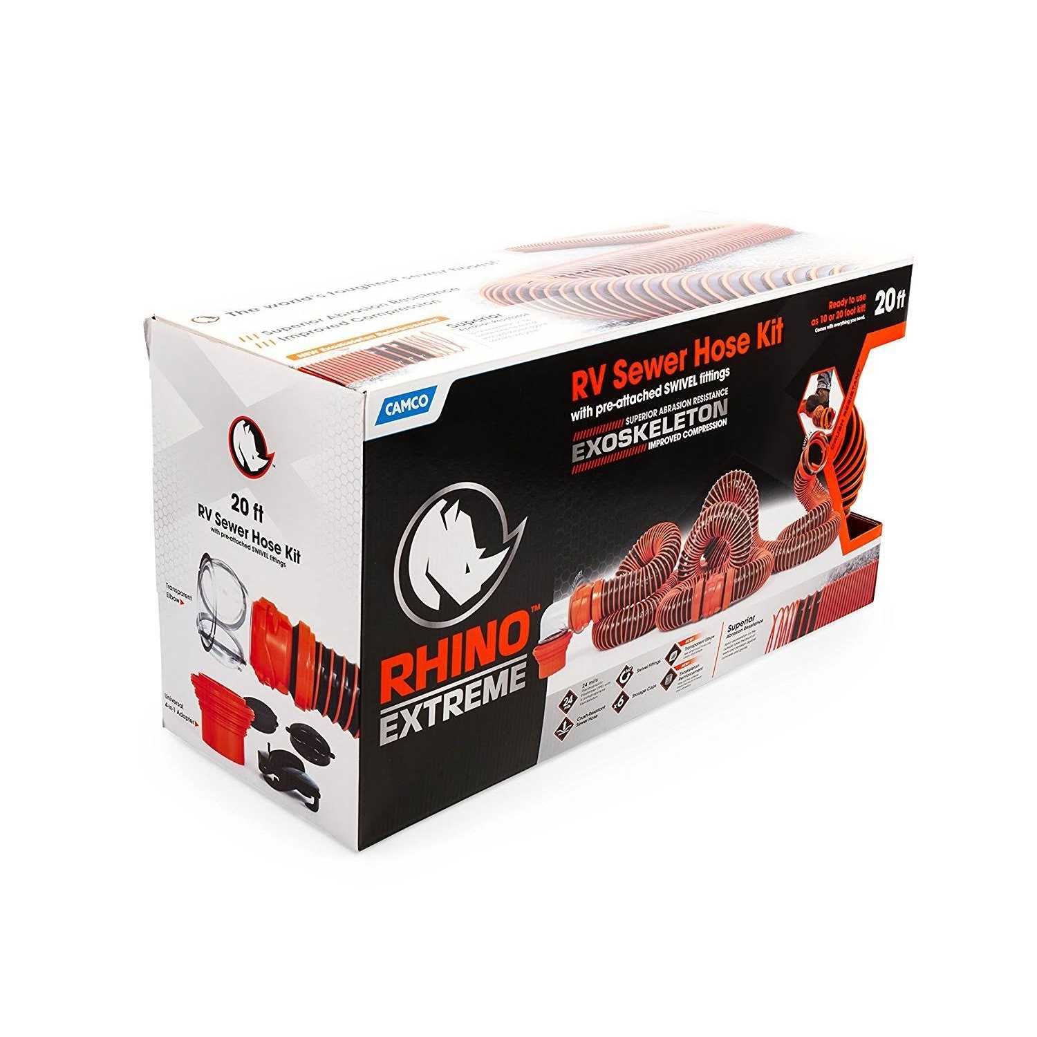 - Camco sewer hose kit includes pre-attached Rhino swivel fittings