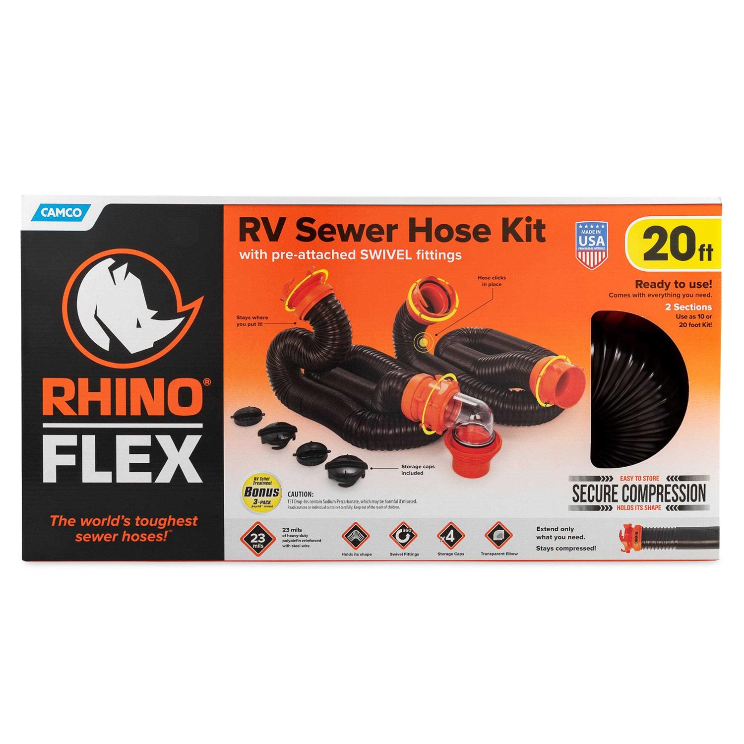 Camco 39742 RhinoFLEX 20′ RV Sewer Hose Kit with Swivel Fitting Product Features Includes two 10′ RhinoFLEX sewer Hoses with pre-attached bayonet and lug Fittings translucent elbow with 4-n-1 adapter and Four storage caps Fittings swivel for ease of use and are detachable RhinoFLEX sewer Hose is made of durable polyolefin and reinforced with Steel wire 4-In-1 translucent elbow adapter fits 3 inch slip or 3 inch 3-1/2 inch and 4 inch threaded dump-station pipes Removable 4-in-1 adapter allows you to store the Hose in 4 inch square bumpers Product Description Camco’s RhinoFLEX 20-foot RV sewer hose kit with RhinoFLEX hose and swivel fittings is a Ready-to-Use kit made with the toughest hose you can buy. The two hoses are made of sturdy polyolefin and are reinforced with steel wire. They are collapsible and you only have to extend as much hose as you need. This kit features bayonet fittings with four prongs for a more secure fit. Included is a translucent elbow with an easily detachable 4-in-1 adapter for connecting to 3-inch slip or 3-inch 3-1/2-inch and 4-inch NPT threaded sewer connection. The fittings swivel and feature Reusable locking rings so that fittings can be moved to a new RhinoFLEX hose if needed. The kit also includes a storage cap for each end. The hose and fittings compress for storage and once the 4-in-1 adapter is removed you can store the hose in standard 4-inch square bumpers.
