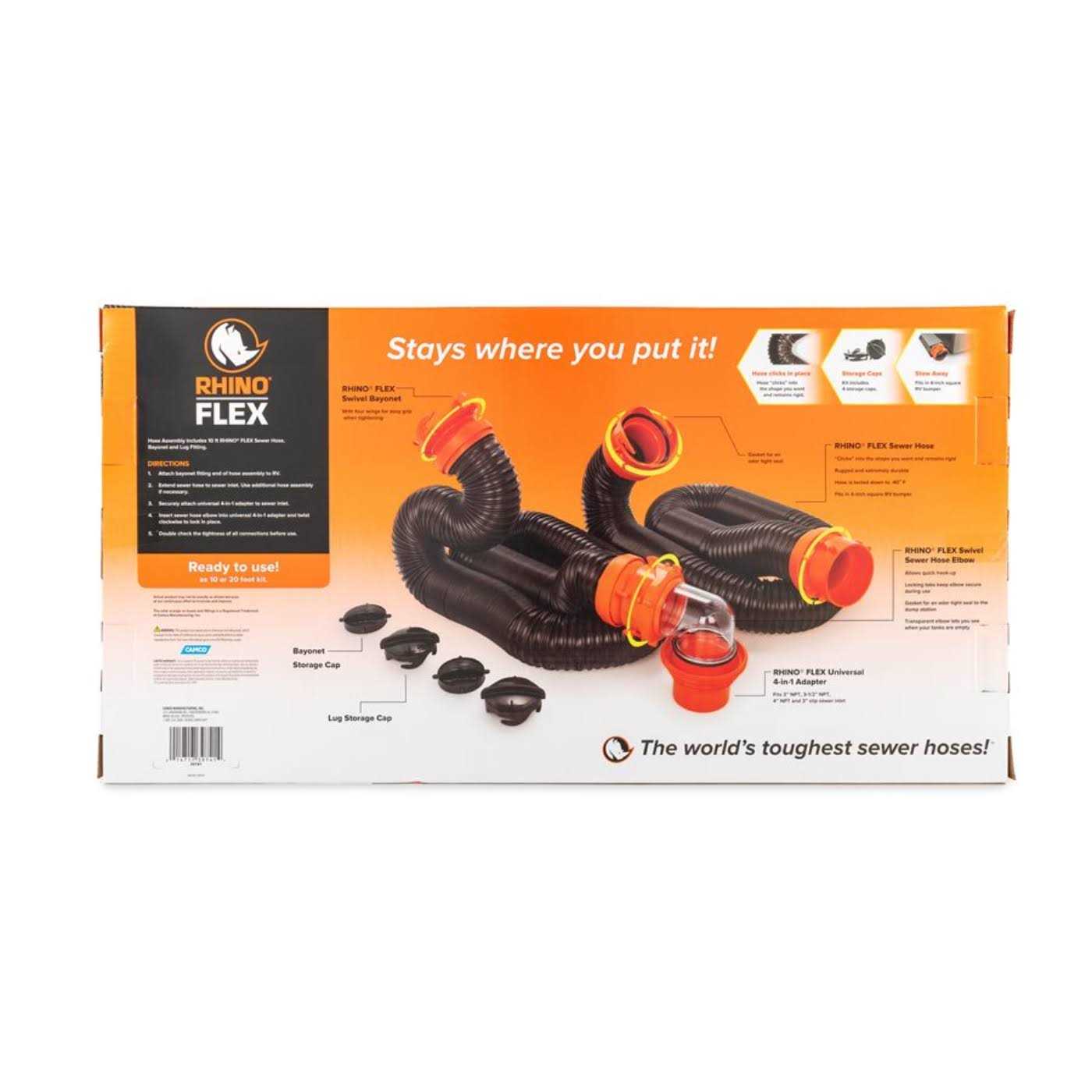 Camcos RhinoFLEX RV Sewer Kit with Pre-Attached Fittings is a ready-to-use kit made with a tough hose that will not dent or rust and will not crush if accidentally stepped on. It offers superior abrasion resistance for maximum protection against pinholes and leaks. The pre-attached swivel fittings feature locking rings so that your fittings stay secured. The RV end of the hose has a super-tough bayonet fitting with 4 bayonets for a more secure fit. The dump-station end has a clear elbow that separates from the 4-in-1 adapter for easy storage. A bayonet cap and elbow cap are also included.