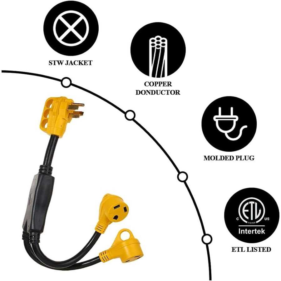 50A Male Plug to (2) 30A Female Connector Rv Power Adapter NEMA 14-50P to 2 x NEMA TT-30R,50A 125/250V to 30A 125V 2.5 Feet Cord length,100% copper wire for reliable conduction and durable. The handles on the back make it easy to connect and disconnect. RV 50A male plug support max 50 Amp overload and RV 30A female connector support max 30 Amp overload.