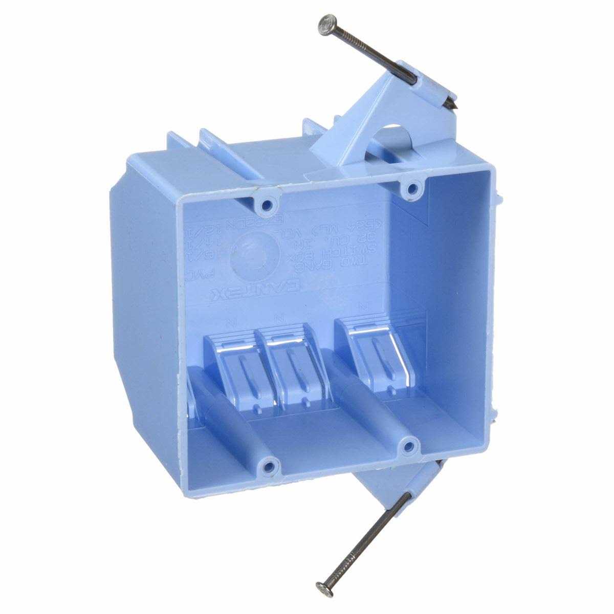 Nails are at an enhanced angle for quick mounting between studs Measures 3.813 Inch x 3.688 Inch Has eight knockouts Cantex EZ Box 2-Gang Residential box is perfect for use on masonry walls. This rectangle box features PVC construction. It has capacity of 32 Cubic-Inch. It is angled nail-on mountable. Residential box is UL listed.