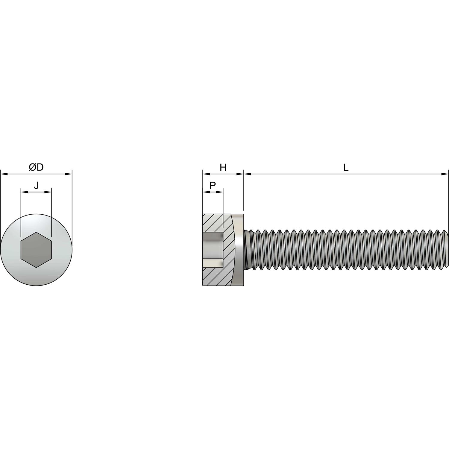 The M8 x 25mm Full Thread Cap Head Screws (DIN 912) – High Tensile Steel (12.9) has the following features:8mm Head Length (H), 4mm Hexagon Depth , DIN 912 Manufacturing Standard, 25mm Length (L), Yes Fully Threaded, High Tensile Steel (12.9) Material, High Tensile Steel (12.9) Material Specification, 1.25mm Screw Thread Pitch, Natural Finish, M8 (8mm) Thread Size, 13mm Head Diameter (D), +0/-0.27mm Head Diameter (D) Tolerance, +0/-0.36mm Head Length (H) Tolerance, 6mm Socket Size (J), Coarse Fine or Coarse?. Discover more about the Metric Socket Cap Head Screws range. Metric Socket Cap Head Screws feature an internal socket drive that is designed for use with a Hex Key, otherwise known as an Allen Key. With the terms ‘socket’ and ‘allen’ being so interchangeable within engineering, this explains why these fasteners are also commonly referred to as Allen Key Bolts or Socket Screws. Accu’s range of Cap Screws are manufactured in accordance with industry standards, such as DIN 912 and ISO 4762. Screws within this range are available in either a fully threaded or partially threaded form, with the latter featuring an unthreaded portion below the head of the screw. The distinction of whether the screw is fully threaded or not is detailed in each individual product specification. If a larger unthreaded portion is required, Accu’s range of Socket Shoulder Screws range may be more suitable, depending upon your application. Metric Cap Head Captive Screws A number of Accu’s Metric & Imperial Socket Cap Screws are also available to be modified to feature a precisely machined unthreaded section, affording a retaining capability. These specialised Captive Screws are used to provide a secure fixture and help to prevent damage or loss of screws in a housing assembly. Accu’s range of Cap Head Captive Screws are designed to aid compliance with EU Safety Directives. Vented Socket Screws Accu can also offer Vented Cap Screws, which are a specially modified variant of this component that allow the release of gases and pressure through a bore that runs through the centre of the screw.