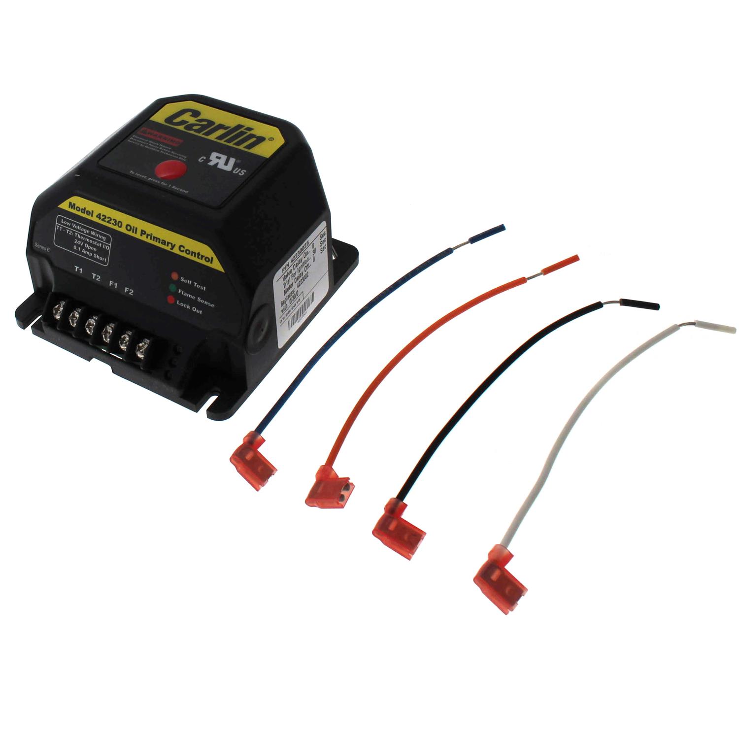 Carlin 42230 Oil Primary Control 4223002S Your Product Information The Carlin 42230 is a recycle type electronic control which provides interrupted duty operation. It is designed to mount directly on top of standard flame retention oil burners. Oil pump bleed assist (up to 1 min), Diagnostic LED s (status, lockout, flame), Recycle on flame failure, Serviceman reset protection (latch-up after 3 consecutive lockouts), Thermostat and aquastat compatible, Increased flame accuracy, Improved SMC technology (zero bleed voltage during standby), Flame stabilize, Works well with generators (insensitive to frequency changes). Power Input 120 vac, 60 hz, 10 va Ignitor Load 120 vac, 60 hz, 500va Motor Load 10 fla / 60 lra Cad cell resistance (with flame) R < 1500 ohms Operating temperatures - +32?? F to 140?? F UL recognized (US & Canada)