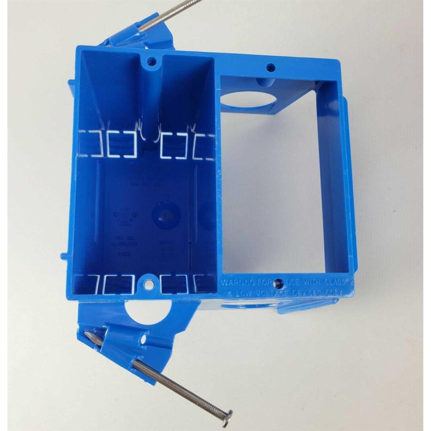 Carlon Dual voltage outlet box/bracket features a backless design that can accommodate large/deep low voltage devices. It accommodates bend radius requirements for low voltage cabling. Box with 3/4 Inch resi-rings overcomes cutting the back off electrical boxes. Compactly designed box accepts a two-gang face plate.