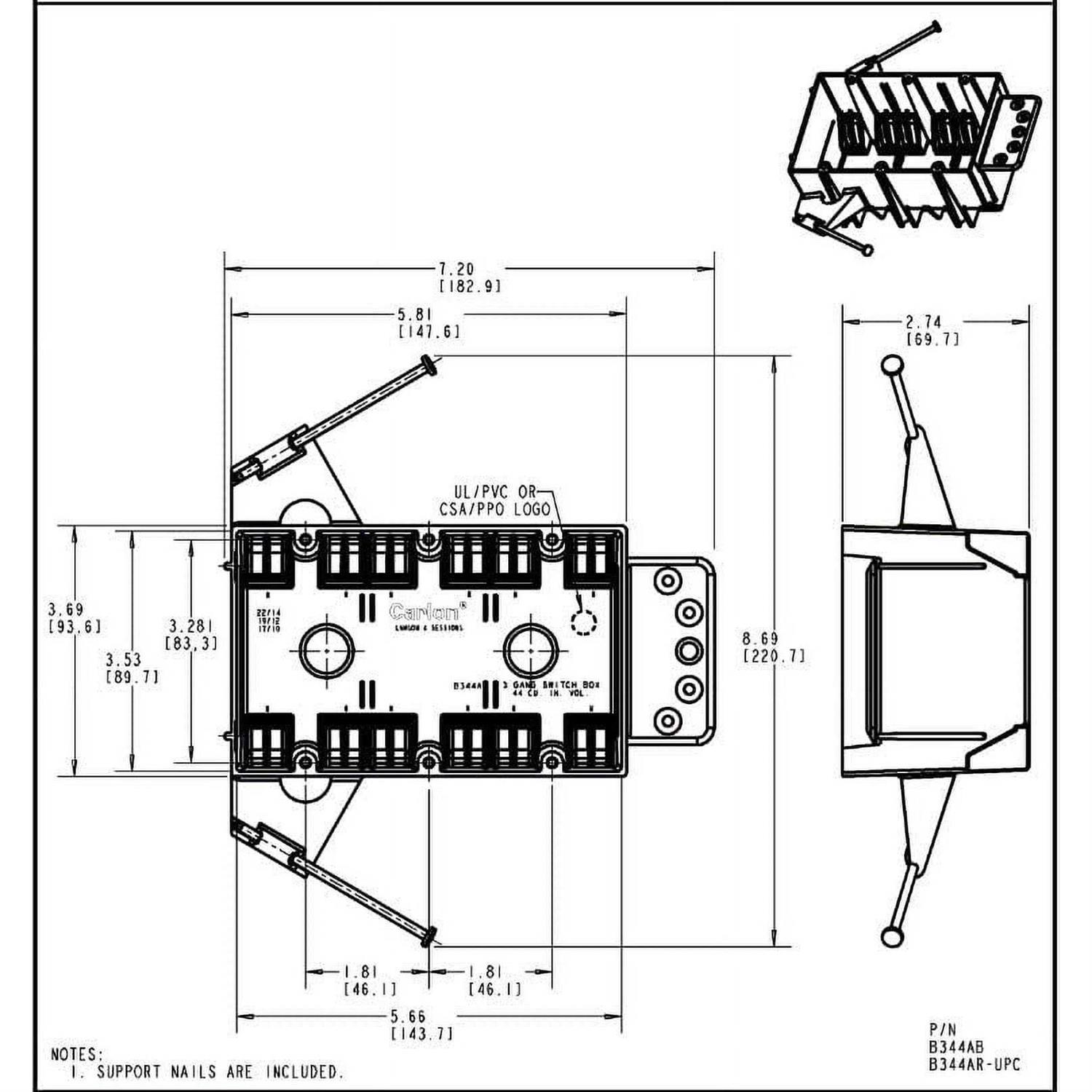 Carlon B344AB New Work Outlet Box, PVC, 44 cu-in Capacity, 3 Gang