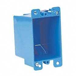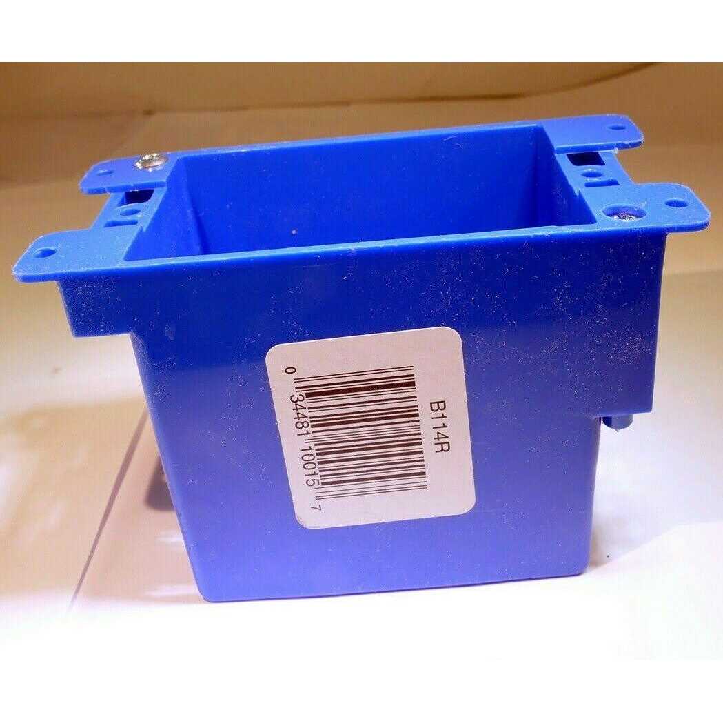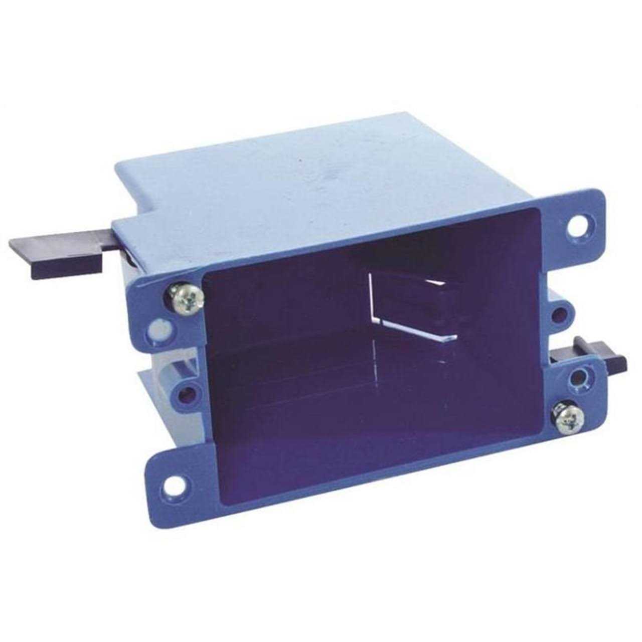 The Carlon B114R-UPC Switch Box is a 1-gang, 14 cu-in nonmetallic box designed for residential, light commercial, and manufactured housing projects. Made from high impact lightweight PVC, this blue switch box features clean and easy knockouts and pre-installed nails for convenience. It is suitable for use with nonmetallic-sheathed cable and is compliant with Article 370 of the current NEC. The box is compatible with a full assortment of round and rectangular covers and adapter rings, making it a versatile choice for various electrical installations.
