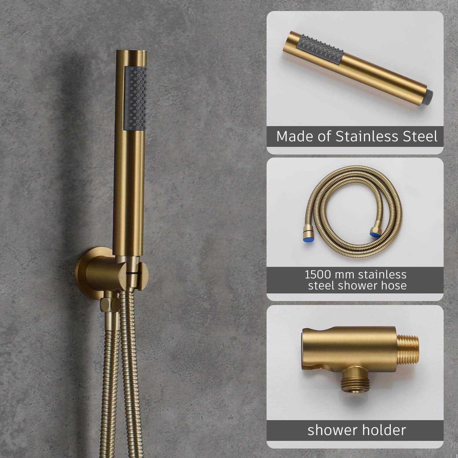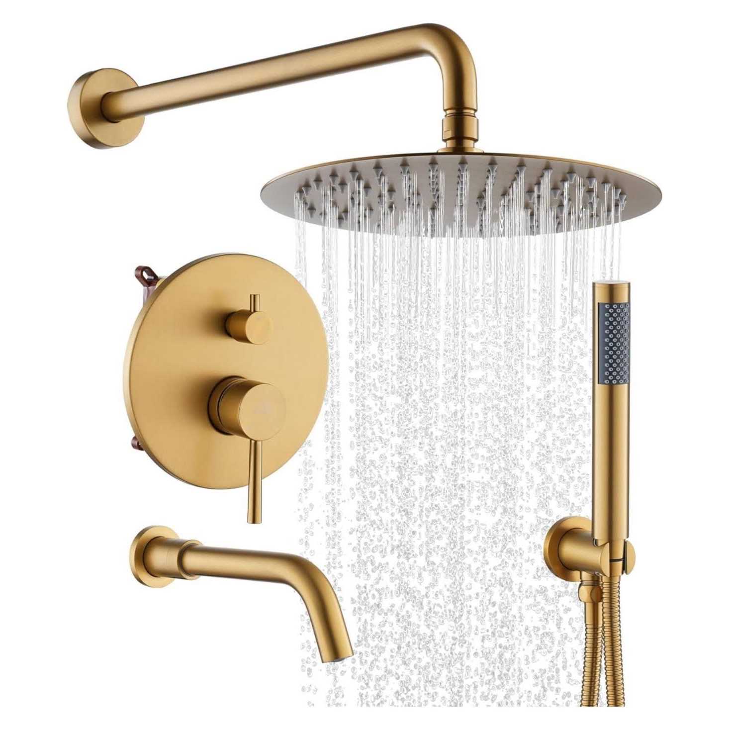 CASAINC 10″ inch Wall Mounted Round Shower System Set with Handheld Spray & Tub Spout – Brushed Gold