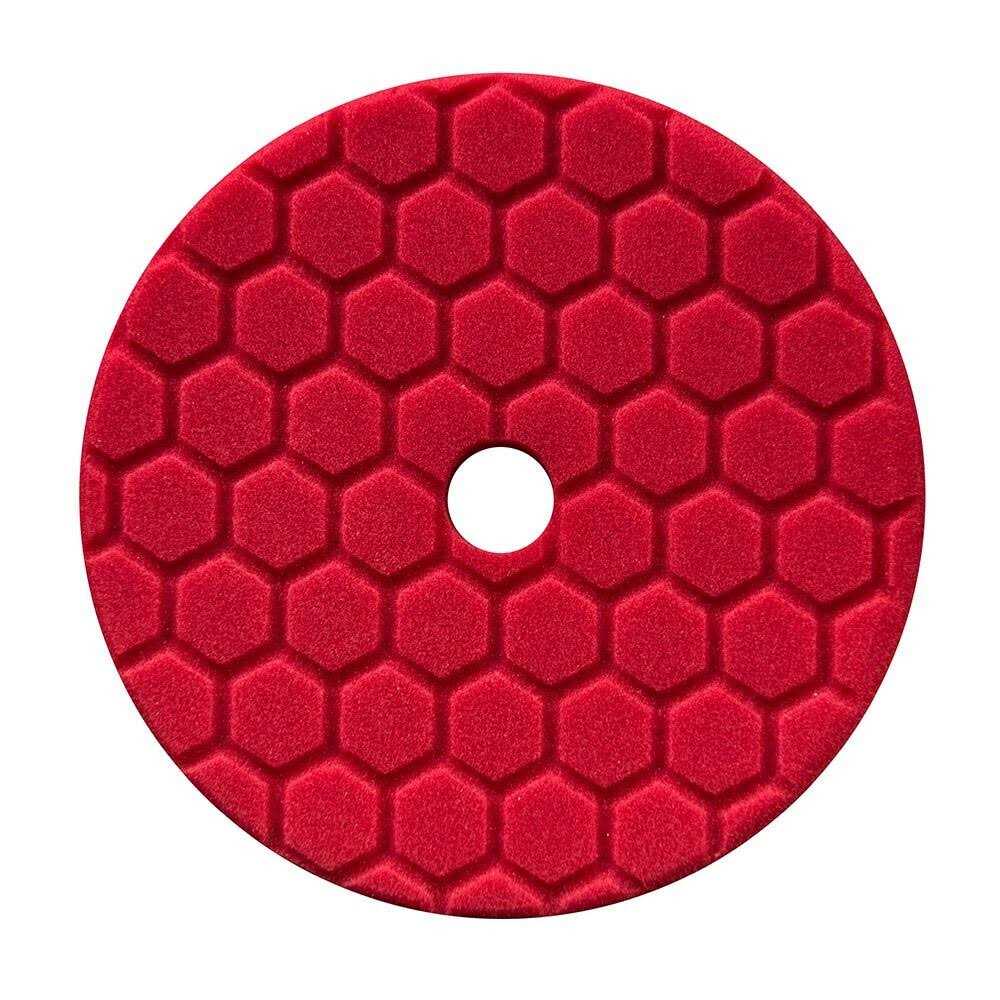 Red Finishing Pads have no cut, are perfect for spreading final sealant and wax coats over sensitive painted finishes, and come in 5.5\u201d, 6.5\u201d and 7.5\ sizes. The soft spreading action of Red Pads is perfect for applying the perfect coat of sealant or wax with the softest touch and minimal product waste. Use Red Pads to spread the perfect coat of synthetic sealants like JetSeal, or natural carnauba waxes like Butter Wet Wax, or soft paste waxes like Lava. Red pads are ultra-soft and perfect for delicate and soft paint finishes for a scratch-free shine. The Red Pad utilizes a patented hexagonal design to maximize surface contact, reduce and disperse heat, and reduce wear and tear on machine and pad. The Hex-Logic surface grooves spread product evenly and conform pad to contoured surface for best results. All Hex Logic pads are available with the Precision Port vent hole that releases heat and reduces stress from the center of the pad.