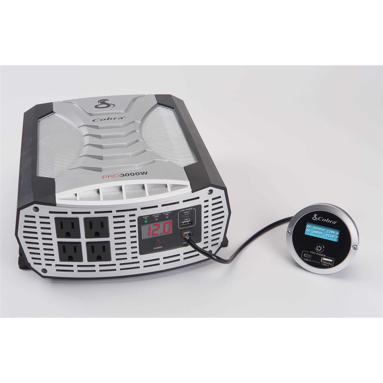 Harness the power of your vehicle’s DC battery. Power up your next pregame add the convenience of home appliances on your next road trip or even turn your car into a mobile office. The Cobra 3000-Watt PRO Power Inverter turns your car battery into usable A/C household current. It is ideal for cross-country professional drivers travelers campers RV enthusiasts or for when a power outage occurs. Count on Cobra for power where you need it.