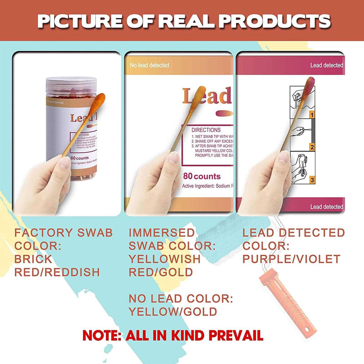 80 Counts Value Pack: 80 Pcs Lead Test Kit in every box, Shelf life 2 years,cost-effective, convenient and valuable. 30 Seconds Instant Results: Lead Paint Test Swab is very sensitive, the test results are obtained in less than 30 seconds. Incredibly Easy to Use: Wet swab tip with water and shake off any excess liquid, after swab tip achieves mustard yellow color, promptily use the lead paint swabs to rub painted surface for 30 seconds. Easy to Check Test Result: After rub painted surface, observe and match the lead test swabs with color on the top or bottom, Red/Purple/Pink it means lead detected. Yellow means NO lead detected. Range of Use: The Lead Test Swab for dishes provide and instant test on most painted metal ceramic surfaces. Including dishes, toys, pottery, jewelry, woodwork, bathtub glazes, antiques, plumbing ect. Note: Please Do Not put it into your mouth and keep out of childen and pets.