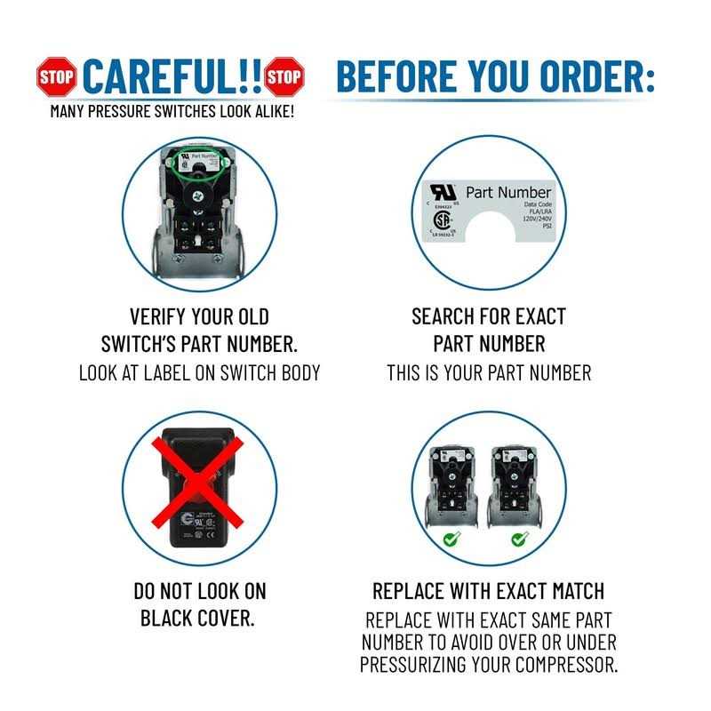 Pressure Switch, Factory On/Off Setting 140/175 Psi, Differential 30 To 65 Psi, Range 40 To 175 Psi, Port Type 4-Port 1/4 In. Fnpt, Manual Switch Action Auto/Off, Contact Form Dpst, Action Standard, Application Air Compressor, Unloader 1/4 In. Compression, Nema Rating 1, Series Mdr11, Hp @ 1 Phase – 120V 2, Hp @ 1 Phase – 240V 3, Temp. Range -22 Degrees To 257 Degrees F, Standards Ul Listed, Csa Certified