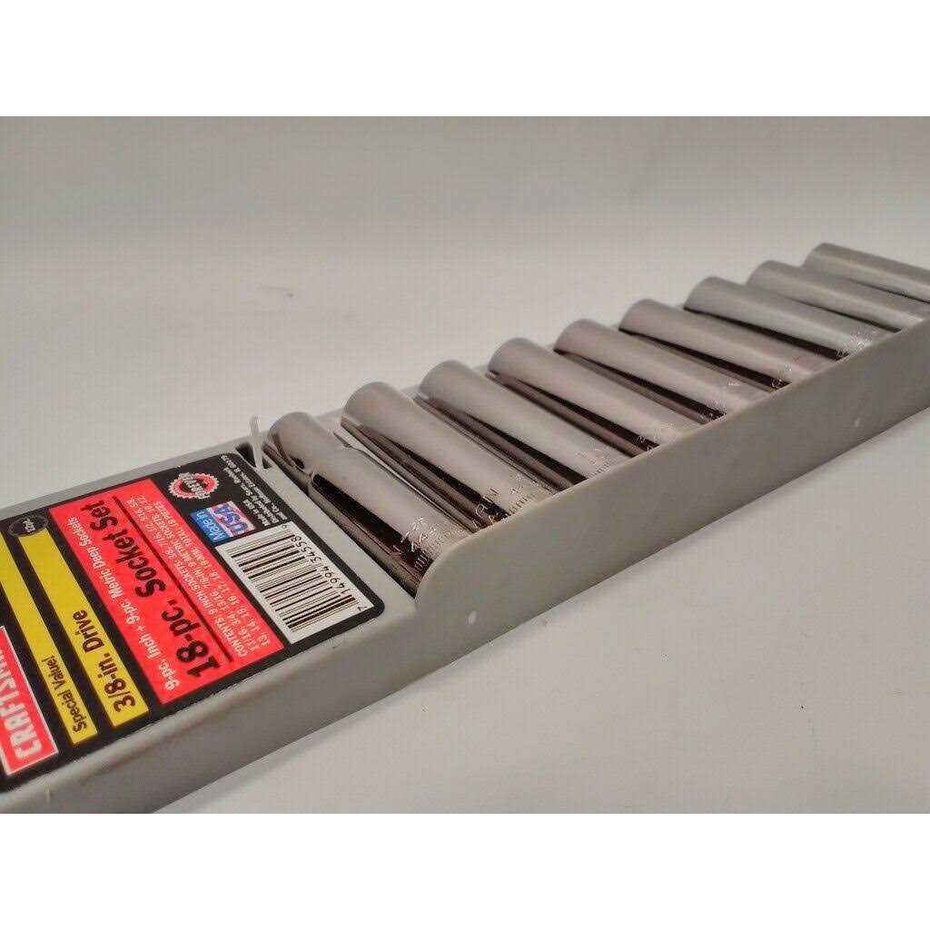 This Craftsman 18 piece 3/8 inch Deep Socket Accessory Set gives you both metric and inch options to fit any job you need to do. The deep sockets stay on tight and turn reliably and the well-made solid set is chrome over vanadium steel. You can count on these sockets for years of use. Reliable precision-calibrated deep sockets run from 3/8 to 7/8 inch and metric sockets from 10mm to 19mm. Get the job done with Craftsman sockets. The 18 piece 3/8 inch Socket Accessory Set is the tool kit you need for auto repair whether American made or foreign. It has all the common sizes for every project you have in mind. Your set comes in a convenient plastic try to avoid fumbling and it’s neatly organized by size and type to save you time.