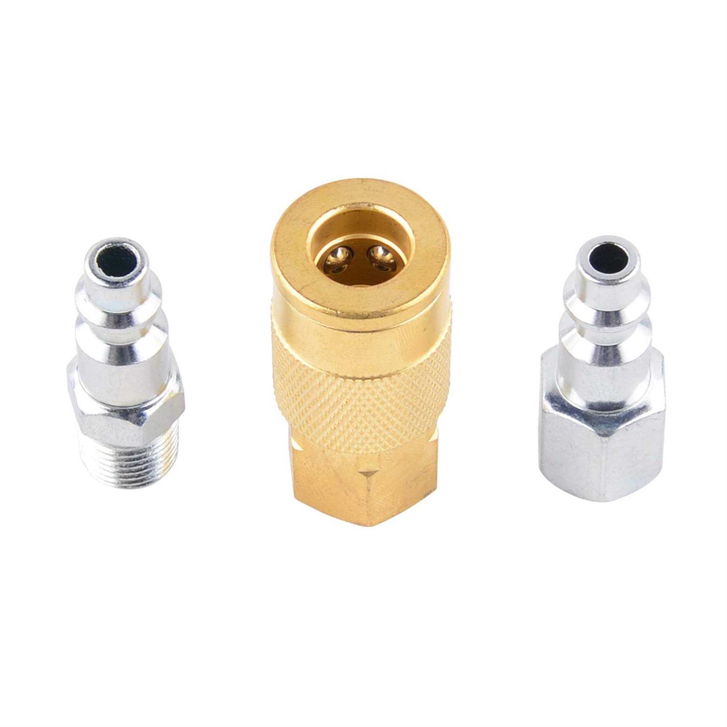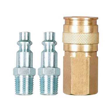 Made from high quality materials, this industrial connection kit includes one steel male plug, one female steel plug and one female brass coupler.