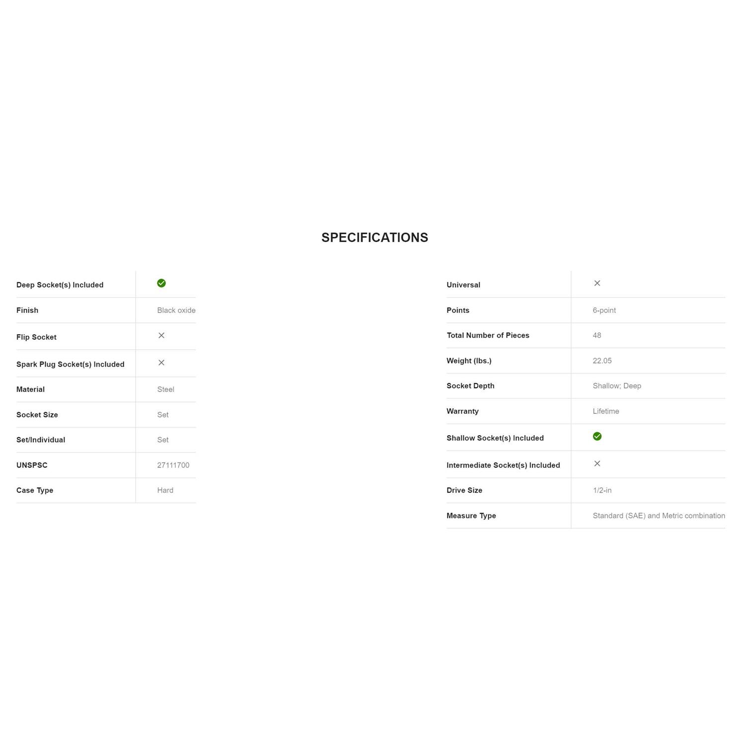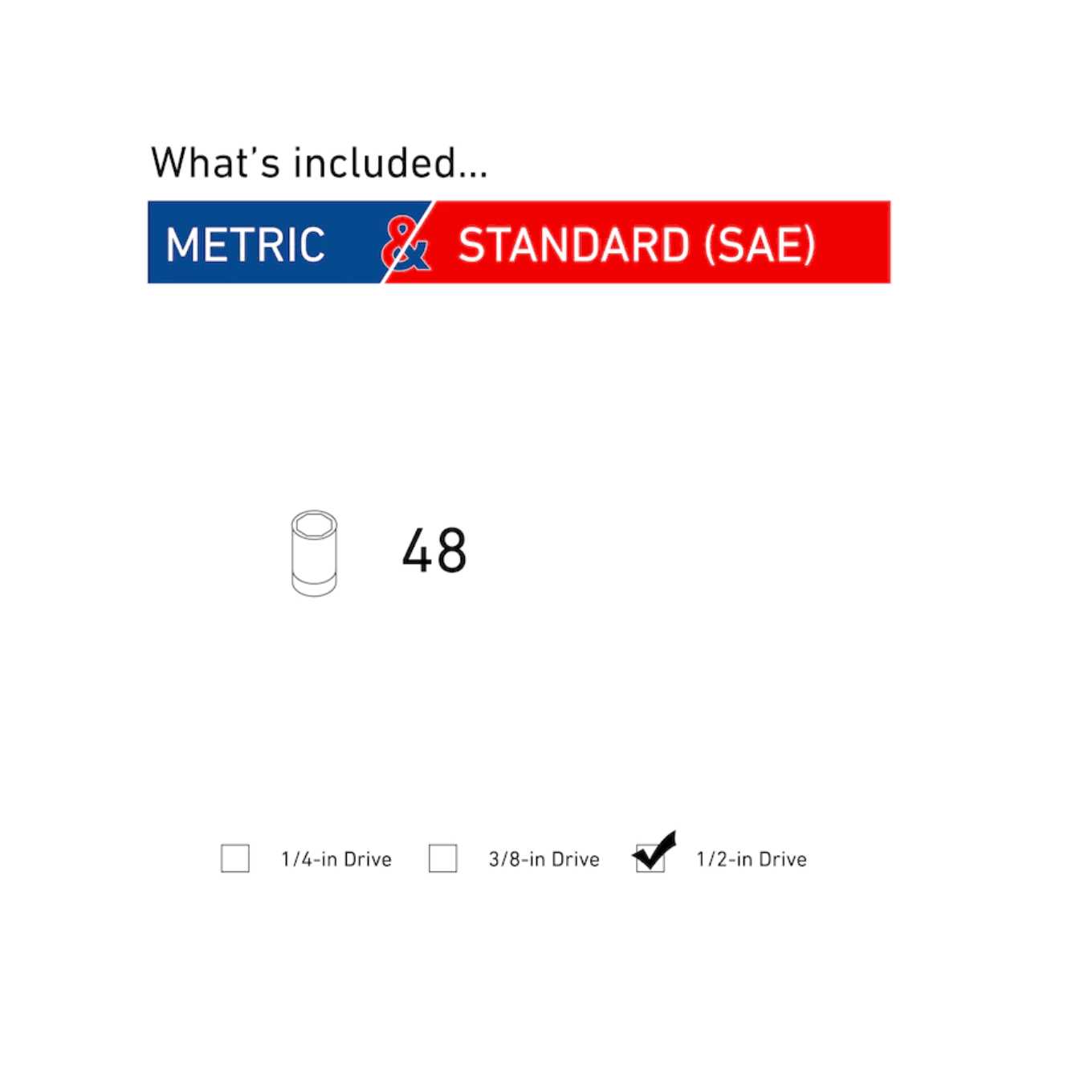 The CRAFTSMAN 48pc impact socket set comes with a black Oxide finish is idea for corrosion resistance and has large markings for quick socket identification.