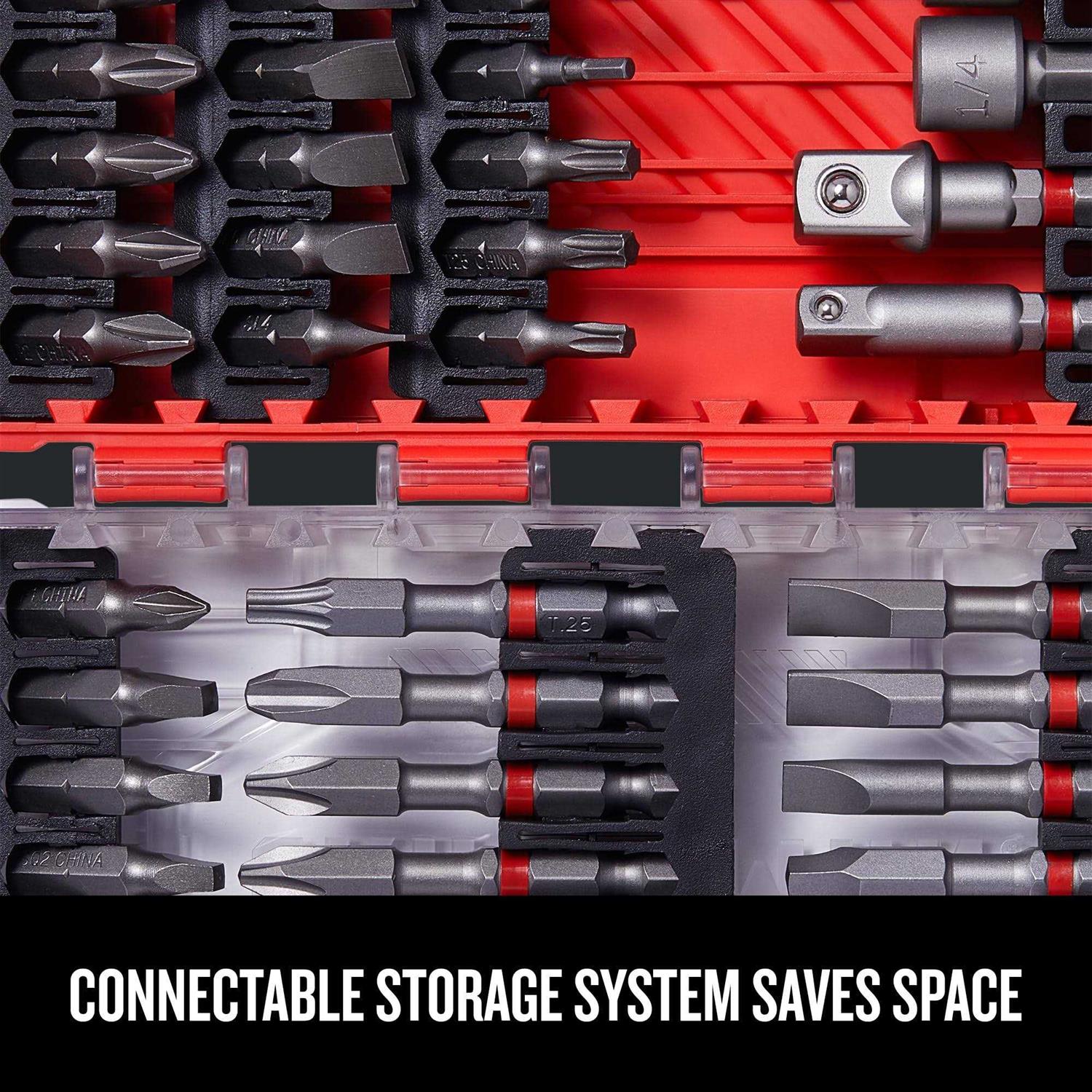 The set contains 28 bit tips, 14 power bits, 2 socket adapters, 2 nut drivers, and a magnetic bit tip holder, each of which are manufactured from durable and shock-resistant S2 tool steel. The bits are also CNC-machined. This is a manufacturing process that ensures the bits fit precisely into the recesses of fasteners so there’s less cam-out and stripping. So, if you’re a CRAFTSMAN enthusiast, you can securely interlock these cases with each other.