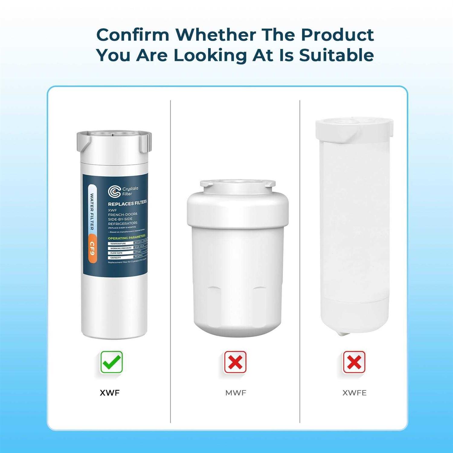 Crystala Filters CF9 Filter Statement: The materials and construction are in compliance with the NSF42 standard. CF9 GE refrigerator water filter reduces Chlorine and improve taste/odor. Find NSF 42 Standard information: Go to NSF’s database, enter certified model number “CF9” or manufacturer “Ningbo Pureza Technology, LLC”. If you find that the product is not NSF42 certified, you can claims identified in the NSF listing. Compatible General Electric (GE) XWF Water Filter Replacement: This xwf water filter ge fridge compatible with select GE french-door & side by side refrigerators, GE XWF genuine refrigerator, WR17X30702, GBE21, GDE21, GDE25, GFE24, GFE26, GNE21, GNE25, GNE27, GWE19, GYE18, QNE27, GSE25, GSS23, GSS25, GZS22, PSE25, CZS22. And also work with new 33% smaller water filter sold Sept 2018 and after. Offers A Precise, Leak-proof Fit: This XWF water filter ge appliances tool-free, no-mess ge xwf refrigerator water filter replacement. Using only high-grade coconut carbon blocks to absorb bad containment. 6 Months Filter Life: For best filtration results, xwf water filter cartridge should be replaced every six months or 200 gallons. Safer drinking, Crystala Filters that protect whole family. p Crystala Filters Replacement GE XWF Refrigerator Water Filter Overview: – Crystala Filters is committed to the development and production of refrigerator filters. Providing you and your loved one’s cleaner, healthier, and better-tasting drinking water at home. – Crystala Filters NSF 42 Certified XWF Refrigerator Water Filter Replacement : – NSF International is an independent nonprofit organization that examines consumer products to ensure they comply with strict standards for certification. By analyzing product materials, observing manufacturing facilities, testing products repeatedly and monitoring product development, the NSF serves as a safeguard for consumer safety. And the Crystala Filters is NSF certified. – Compatible Refrigerator Water Filter Models: GE XWF, WR17X30702, GBE21, GDE21, GDE25, GFE24, GFE26, GNE21, GNE25, GNE27, GWE19, GYE18, QNE27, GSE25, GSS23, GSS25, GZS22, PSE25, CZS22, etc. – Suitable for 2 Kinds of Refrigerator: – 1. Side by Side Refrigerator: Line up the arrows on the filter and the filter cartridge holder and gently push the filter up inside the holder. Slowly turn the filter to the right until it stops. – 2. Bottom Freezer Refrigerator: Line up the ports on the filter as the picture shows and gently insert the filter. Then slowly turn the filter to the right until the arrows are lining up. /p