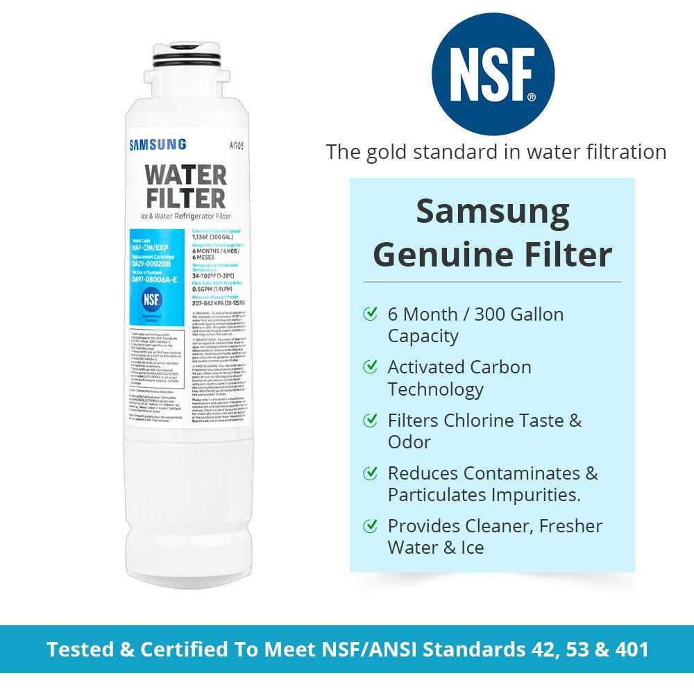 Samsung water filters are tested and certified. Remove over 99 percent of numerous potentially harmful contaminants, using a high grade carbon block.Long lasting up to six months or 300 gallons.All Samsung water filters are tested and certifiedEliminates harmful chemicals to provide safer drinking water.