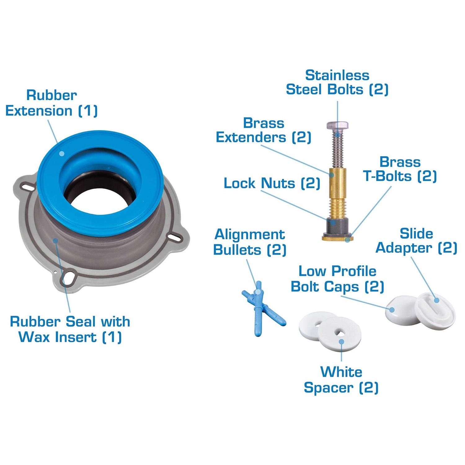 The patented design combines specially designed rubber gaskets with encapsulated wax that forms a seal three times stronger than a wax ring without the mess and allows the toilet to be repositioned if needed during installation. The zero cut bolts eliminate the hassle of typical toilet bolts that are too long锛? wobble and are difficult to line up when setting the toilet. The universal bolts work with flanges above or below the floor and can be adjusted in height from one inch to three inches without cutting锛? removing the threat of chipping or cracking the toilet due to over tightening.