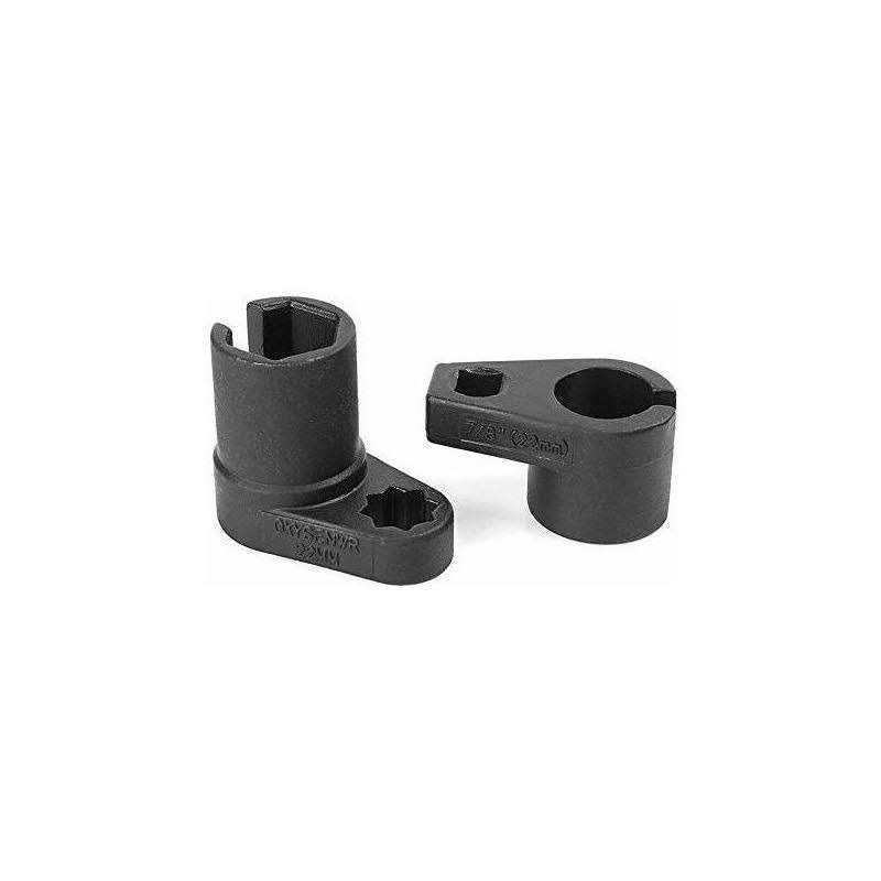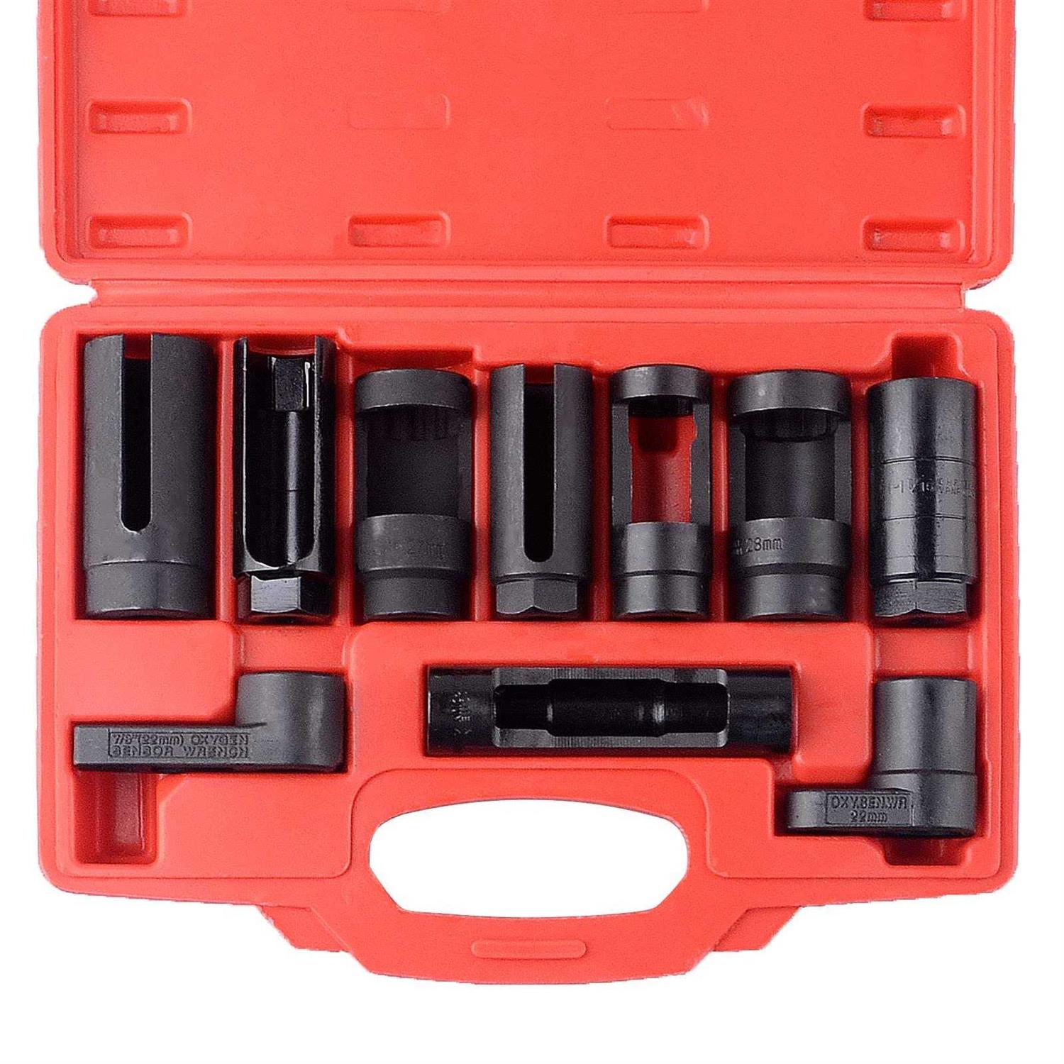 Remove Oxygen Sensors, Injectors, Oil Pressure Sending Units and Vacuum Switches Heat Treated Chrome Vanadium and Chrome Molybdenum Steel with a Black Oxide Finish Accepts either 3/8 inch or 1/2 inch Square Drive Ratchet Depending on the Size of the Socket 10pc Set Includes: 1-3/16 inch (29mm) x 1/2 inch drive oil pressure sending unit socket 7/8 inch (22mm) x 3/8 inch drive universal vacuum PVS, TVS valve and oxygen sensor socket 1-1/8 inch (28mm) x 1/2 inch drive injector socket 7/8 inch (22mm) x 3/8 inch drive oxygen sensor socket 7/8 inch (22mm) x 1/2 inch drive injector socket 1-5/8 inch (27mm) x 1/2 inch drive GM thermal sensor switch socket 1 inch and 1-1/16 inch x 3/8 inch drive oil pressure sending unit socket 7/8 inch (22mm) x 3/8 inch drive low profile offset oxygen sensor socket 7/8 inch (22mm) x 1/2 inch drive long-reach vacuum switch socket 7/8 inch (22mm) x 1/2 inch drive oxygen sensor socket Also Includes a Blow Mold Case for Storage