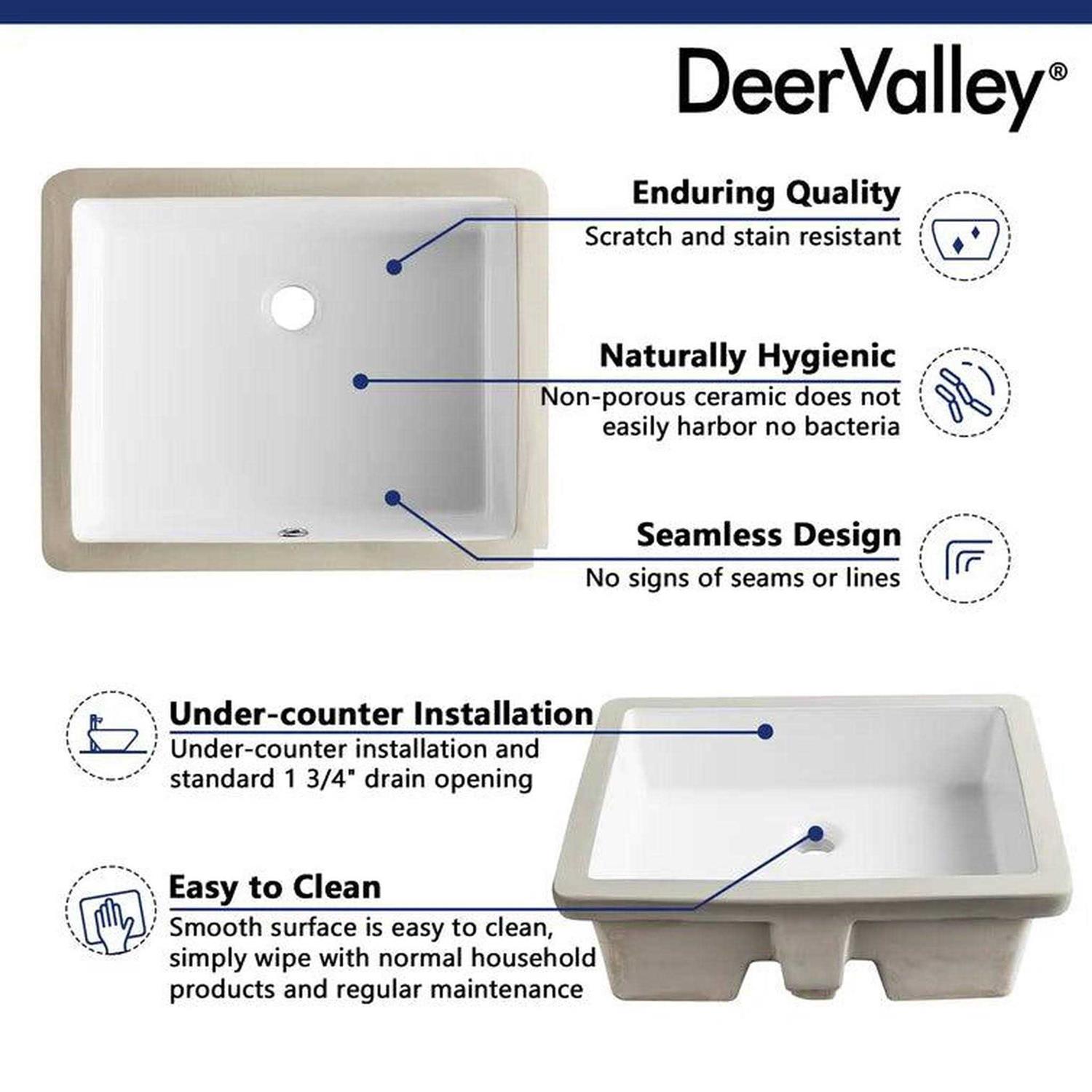 DeerValley Deervalley rectangular undermount bathroom sink provides a refined look for your bathroom decoration. Its spacious rectangular design perfectly combines classic style and versatility, making it an excellent choice to complement traditional and modern bathrooms. This undermount bathroom sink is made from vitreous china, making it sturdy, durable and effective against stains and germs. Undermount installation saves more space on your countertop, meeting your space requirements. With an overflow hole, it can prevent excessive water filling.