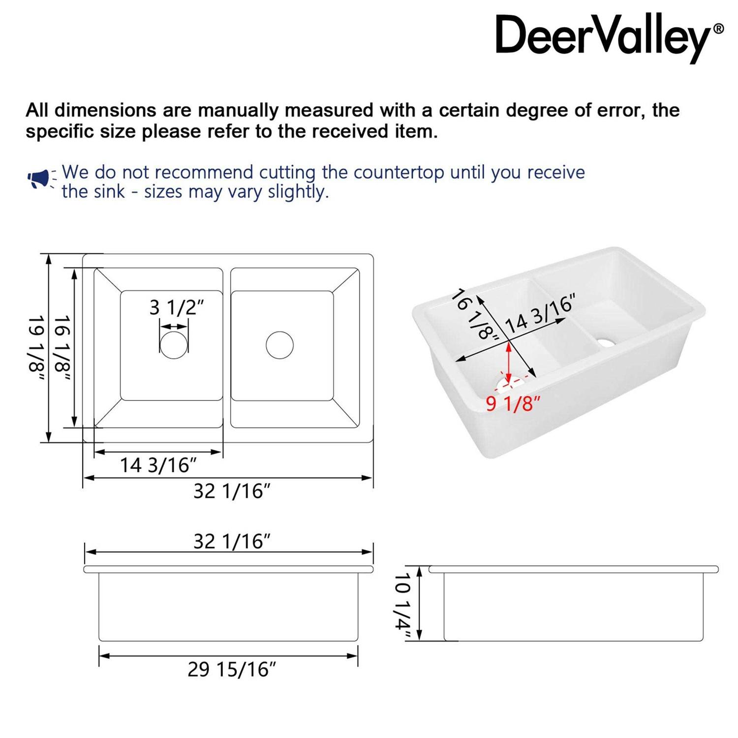 Made of elegant fireclay material with refined glossy glaze, the DeerValley kitchen sink with enormous extra-large bowl provides a perfect fit for any style of kitchen.Offering the look of an modern and stylish sink with generous space for filling pots, stacking dishes, cleaning and preparing meals. Large kitchen items such as baking sheets, pots and pans can be maneuvered easily within the rectangle sink. A convenient dual mount design allows you to install this sink as an under-mount, or as a top-mount with any type of kitchen counter. Classic style combines with functionality and durability and takes your kitchen to the next level! Suitable for both undermount and drop-in installations. Includes removable protective bottom grid and basket strainer. Fireclay fired at 2200°F and 2900°F for 24 hours for durability. Gently sloped bottom with optimized angle helps prevent water from pooling in the sink while not causing dishes to slide and collide. 31 15/16”(L)x19 1/16”(W)x10 3/16”(H). Interior Dimensions: 28 3/16”(L)x15 3/16”(W)x9 5/16”(D). Minimum Base Cabinet Size (recommended): 35 inch. Stainless sink grid and basket strainer included for your convenience.