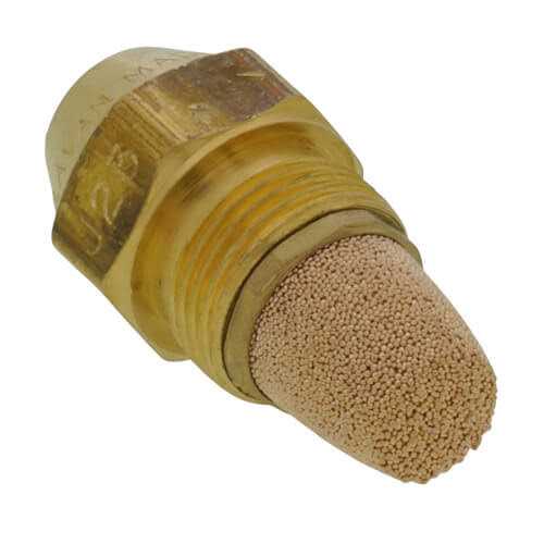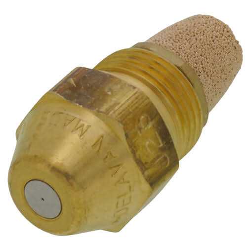 The DELAVAN 1.00 70A Oil Nozzle has a stainless-steel, hollow orifice and features a brass body. Type A-nozzles are mainly used on burners with a hollow cone air pattern and for through puts up to 2.00 GPH. The droplet distribution is concentrated on the outside of the cone and results in good ignition and low-noise combustion. This boiler replacement part is compatible with an oil-burning appliance.