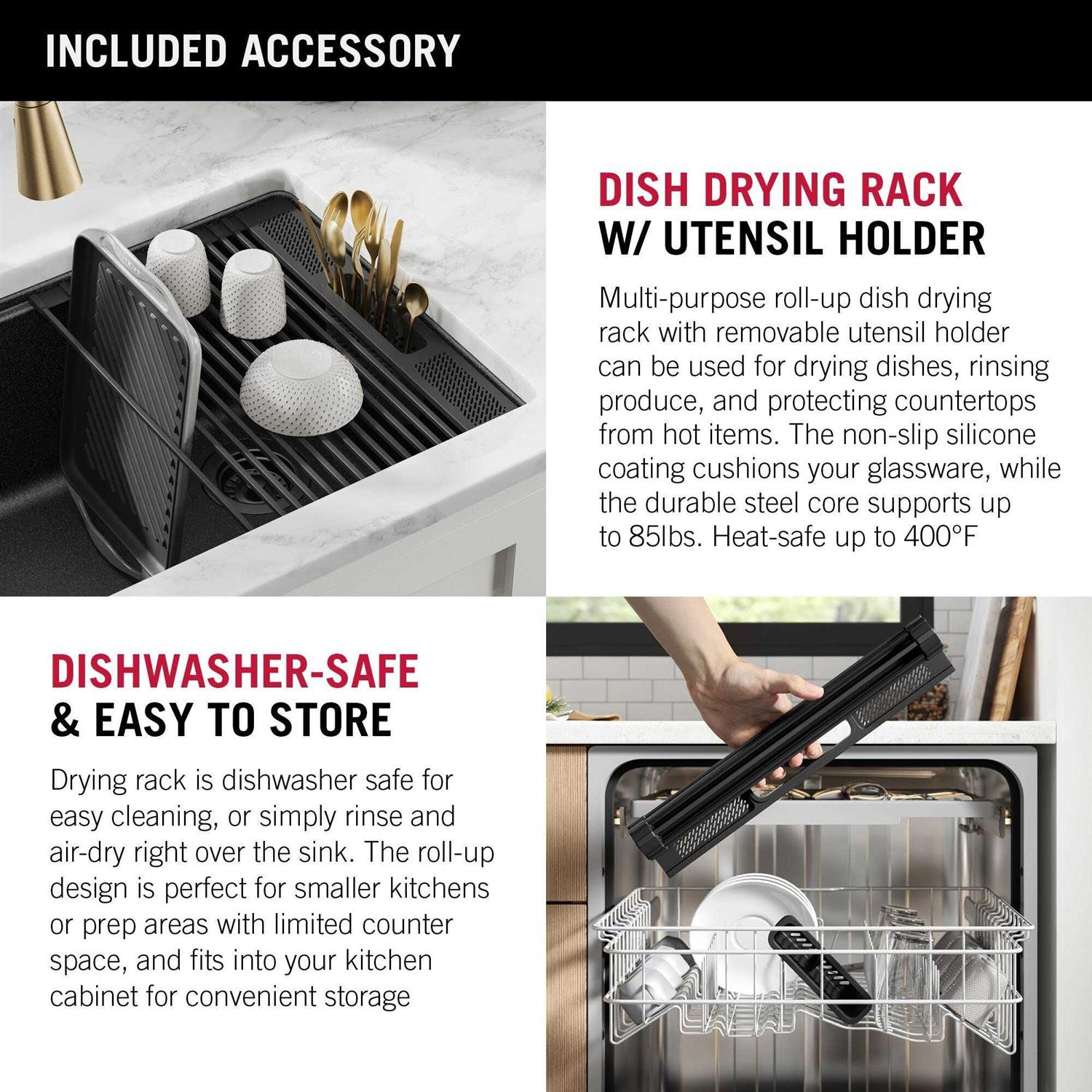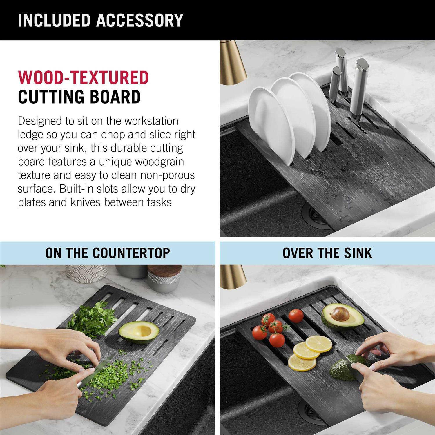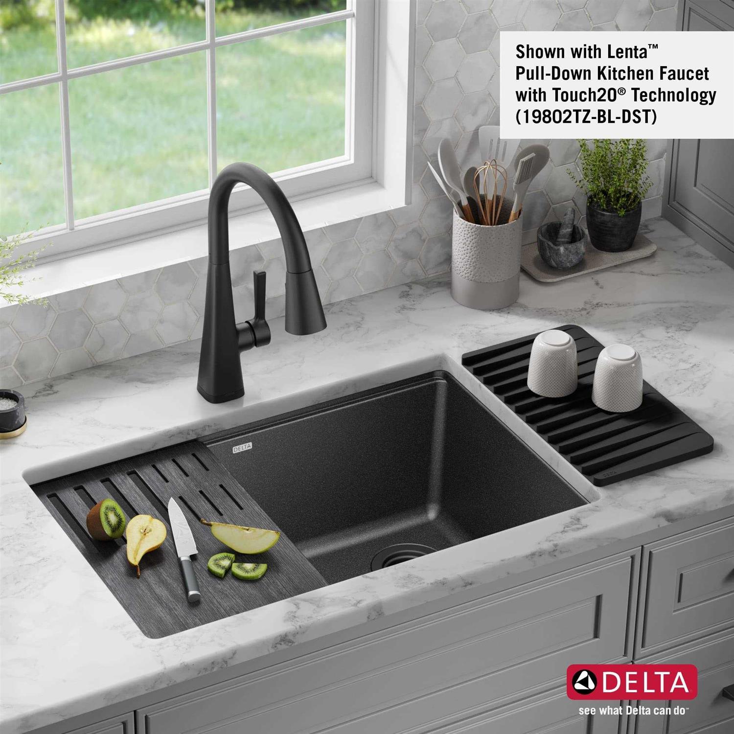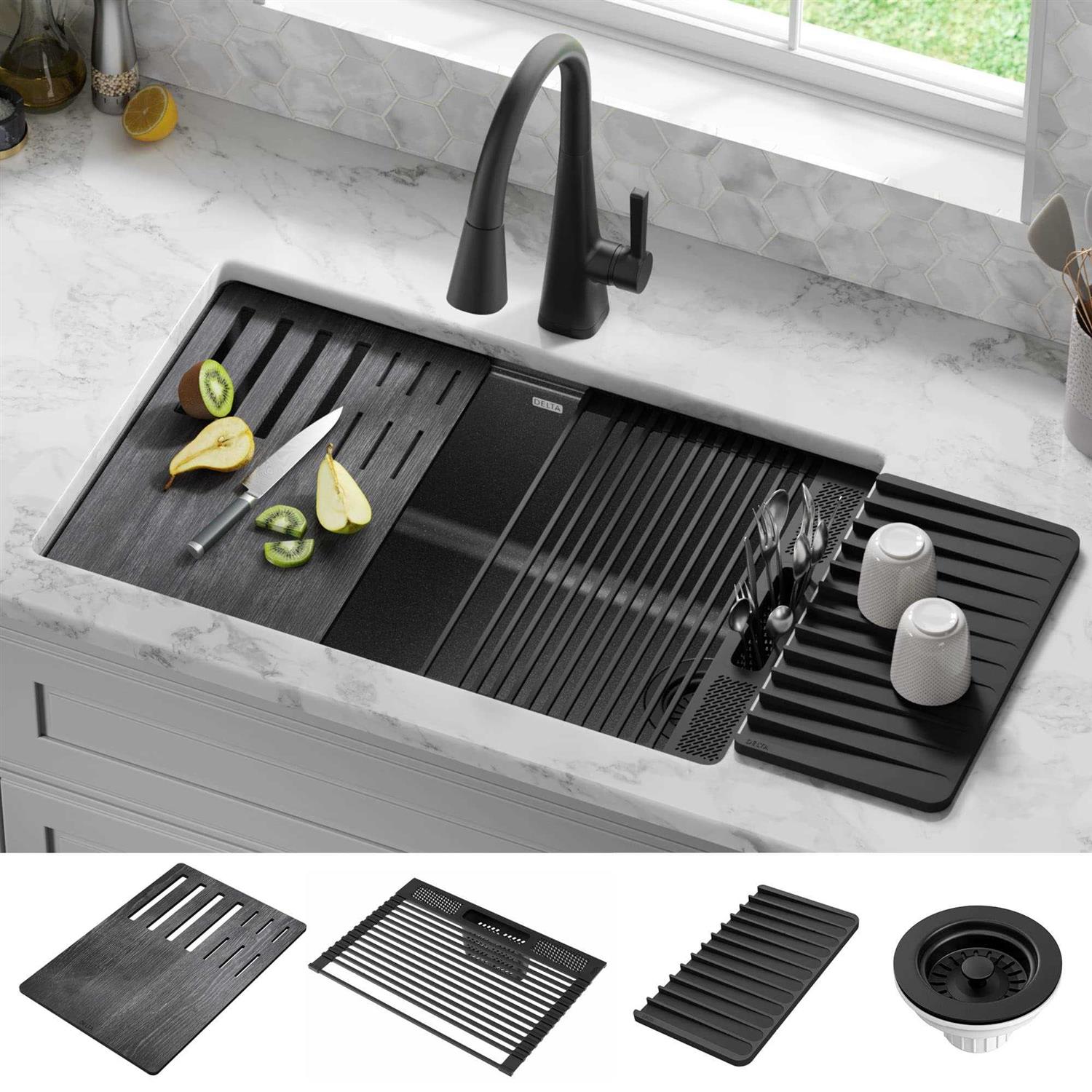 The Delta Everest Granite Workstation Collection combines contemporary design with innovative composite material that adds character to any kitchen. With a built-in Workflow ledge for sliding accessories, this sink creates a multi-functional workspace for seamless transition between tasks. Kit includes a cutting board, roll-up dish rack and silicone drying mat so you can prep and clean right over the sink. Offering the look of real stone, the advanced granite composite is resistant to impact, scratches and stains, not prone to fading and easy to clean. The large single bowl undermount sink installs seamlessly with no exposed mounting deck, allowing you to wipe water and crumbs directly into the sink. Installation-ready sink comes in black, white or grey with matching drain assembly.