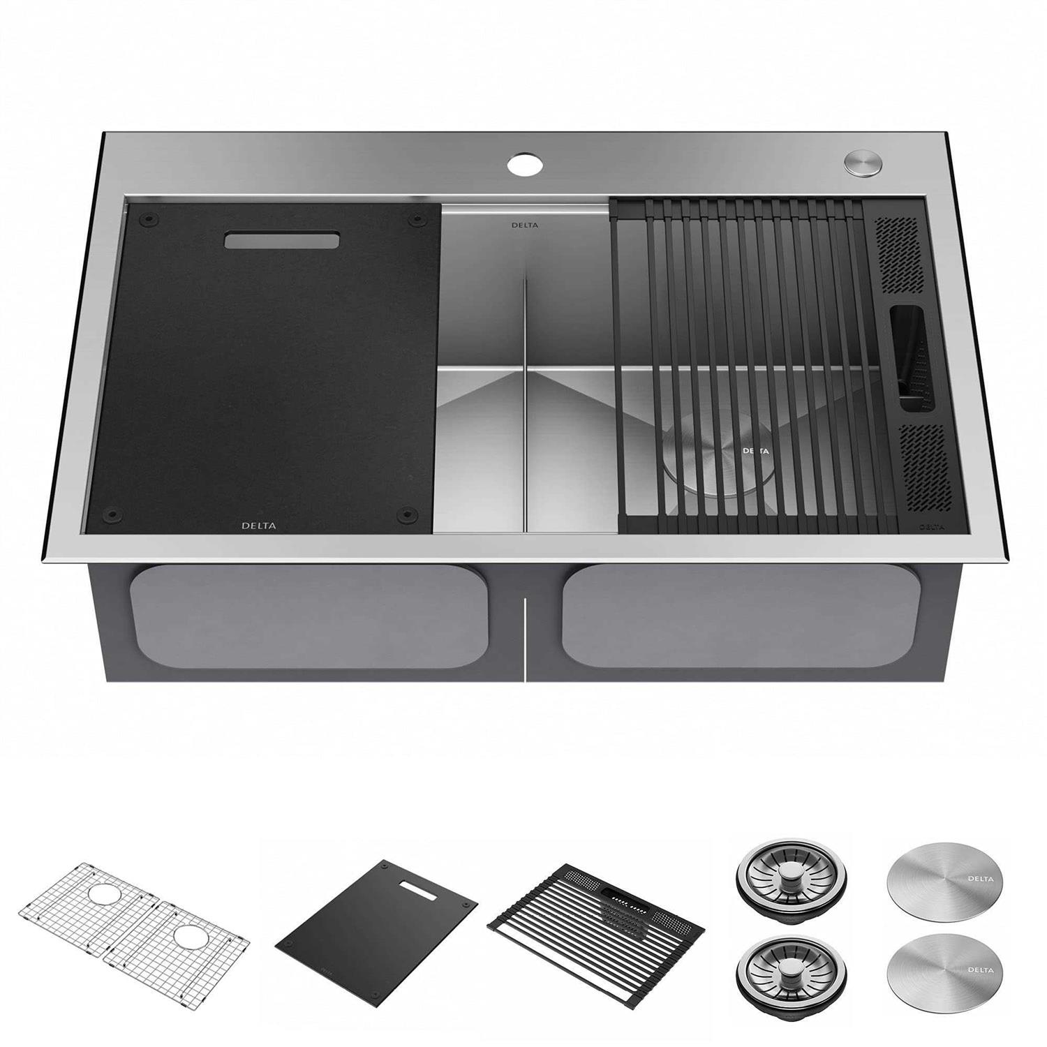 Delta – Rivet 33in Workstation Kitchen Sink Drop-In Top Mount 16 Gauge Stainless Steel 50/50 Double Bowl with Workflow Ledge and Accessories