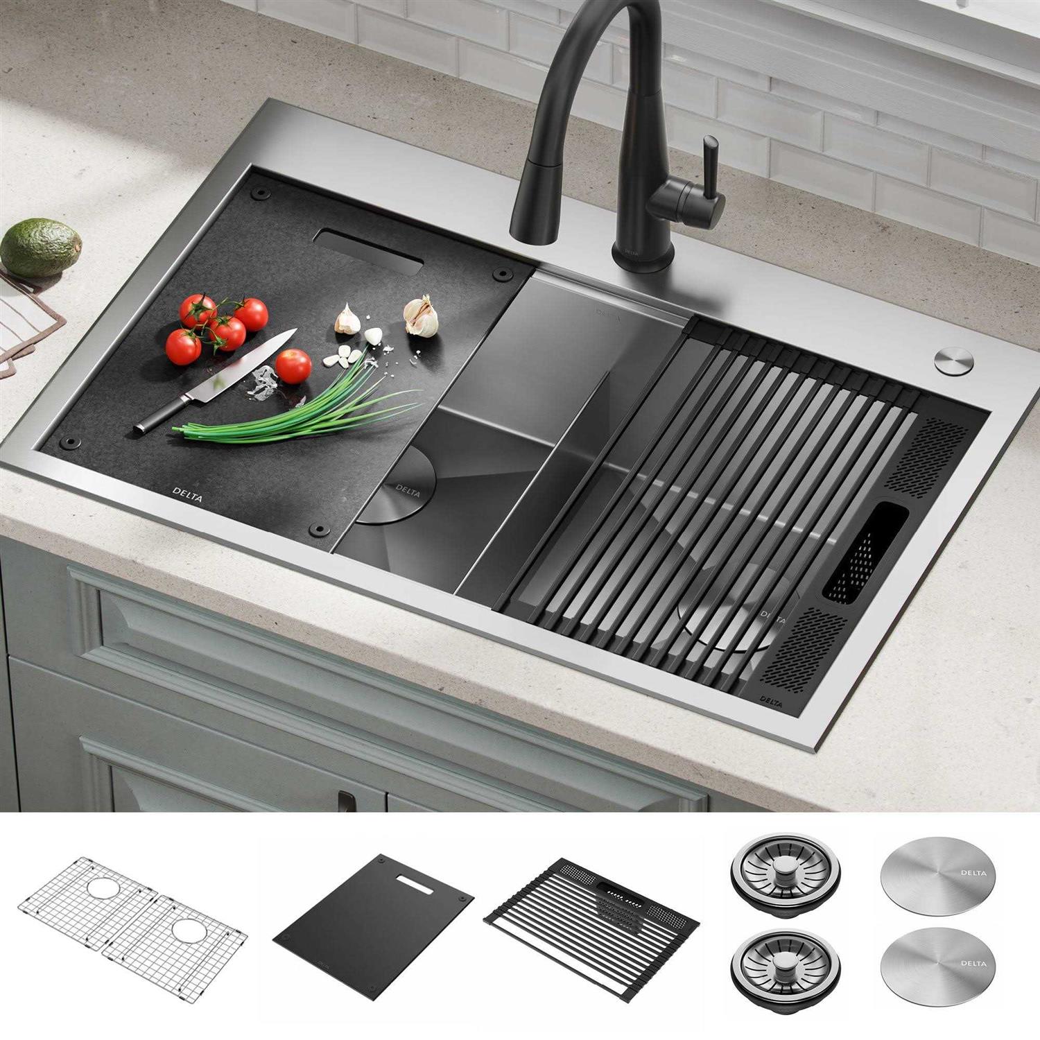 Delta Creates a streamlined contemporary look in any kitchen. These sinks are designed with a built-in workflow ledge that helps make food prep easy by allowing you to slide accessories across the sink, creating a multifunctional work surface for a seamless transition between tasks. The accessory kit includes a durable cutting board and roll-up dish rack with a removable utensil holder that allows you to combine prepping and cleaning in one convenient location. The extra-deep single bowl offers enough room to wash your largest items while containing the mess and splatter inside the sink. Multi-layer NoiseDefend soundproofing reduces noise and vibration from dishes, running water, and garbage disposal. SatinSheen commercial-grade satin finish provides a smooth surface that’s easy to clean and maintain, so your sink stays beautiful with minimal effort. Drainage grooves and a gently sloped bottom improve drainage, while EZClean corners reduce messy build-up over time.