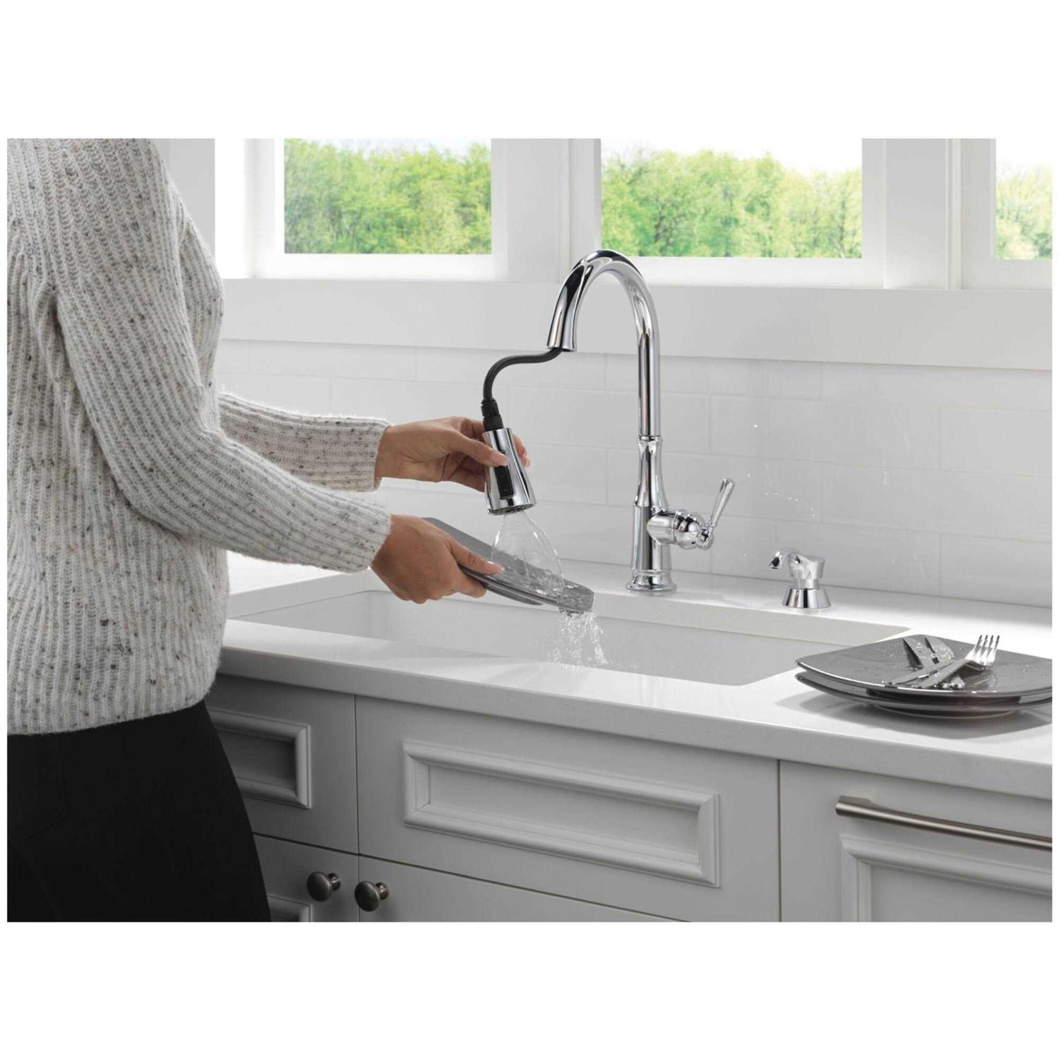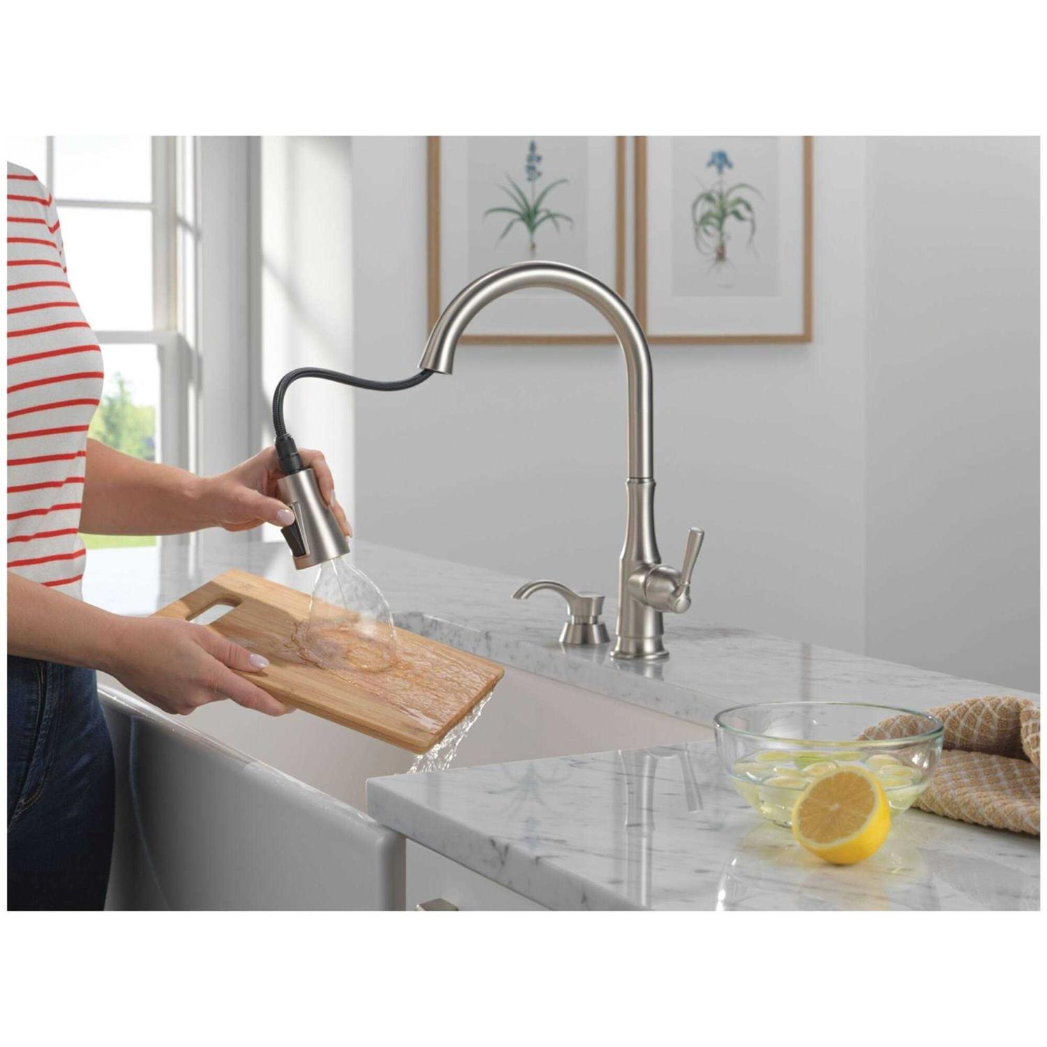 The Capertee kitchen faucet brings clean lines and dimensional detail to your kitchen. This uses a powerful integrated magnet to set your pull-down sprayer precisely into place and hold it there so it stays docked when not in use. Shield spray technology uses a concentrated jet to power away stubborn messes while an innovative shield of water contains splatter and clears off the mess, so you can spend less time soaking, scrubbing, and shirt swapping. Delta kitchen faucets with diamond seal technology perform like new for life with a patented design that reduces leak points, is less hassle to install, and lasts twice as long as the industry standard.