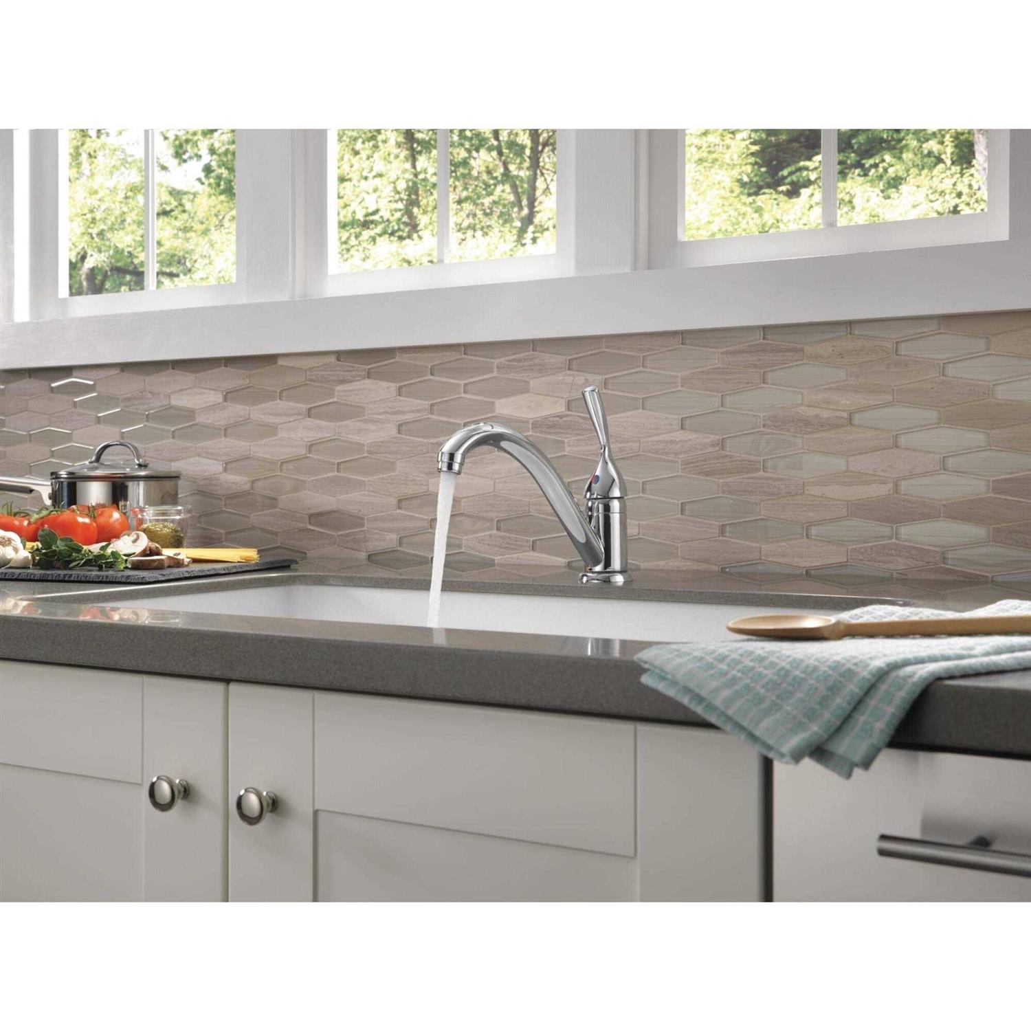 Delta The Delta Classic 3-Hole Installation Kitchen Faucet with Diamond Seal Technology is the perfect addition to your kitchen sink to make it look elegant. This faucet is made from solid brass, which makes it sturdy and durable. It has a chrome finish that blends well with modern kitchen decors. It has a single handle for easy control of flow of water. This faucet comes with a deck mount that is easy to install. It has a spout that swivels 360 degrees, which makes it helpful while cleaning large vessels. This Classic 3-Hole Installation Kitchen Faucet with Diamond Seal Technology from Delta is ideal for single-hole installation.