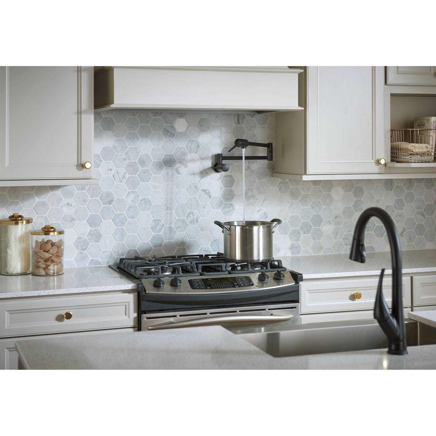 Filling pots on the stove has never been easier or more affordable, thanks to the new Delta Pot Filler faucet. The ADA compliant Pot Filler features a wall-mount, dual swing joint design with dual shut off valves and a 4 gpm flow rate to fill large pots in no time. A pot filler makes it easy to fill large cooking vessels quickly and without the walk from sink to stove. Contemporary Wall Mount Pot Filler. Dual shut off on the Delta Pot Filler faucet allows the user to turn the water off at either the wall or the spout, controlling the water flow at the point of use. 4 gallons per minute for quick fills. 24 in. dual swing joints allow the pot filler to easily fold away when not in use. Simple on and off with a quarter turn of the handle. Meets standards set by Americans with Disabilities Act (ADA). Single hole installation. Assembled dimensions: 8-1/8 in. H x 21-9/16 in. D x 2-1/8 in. W.