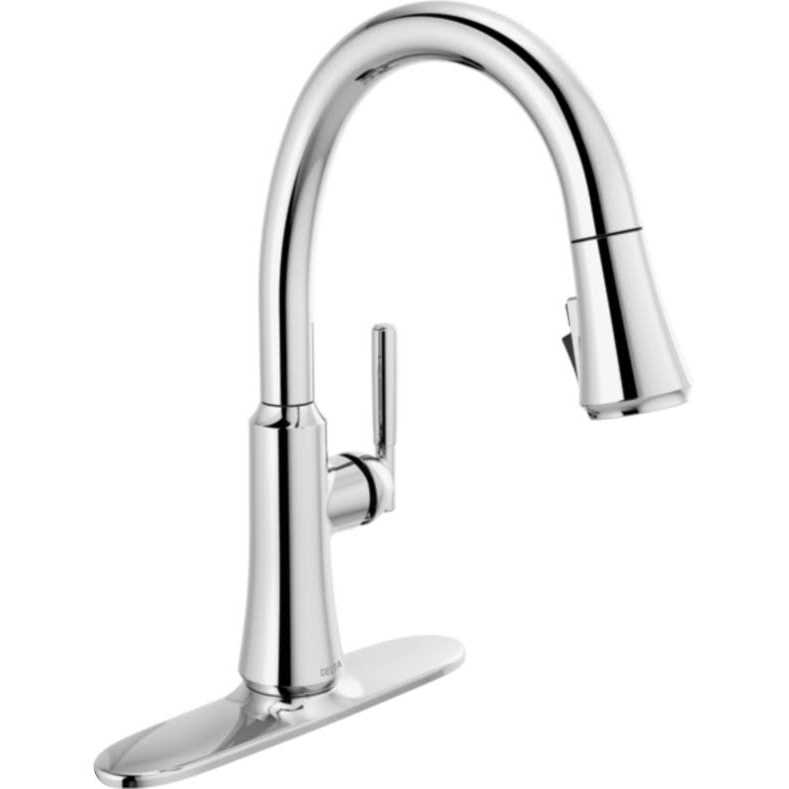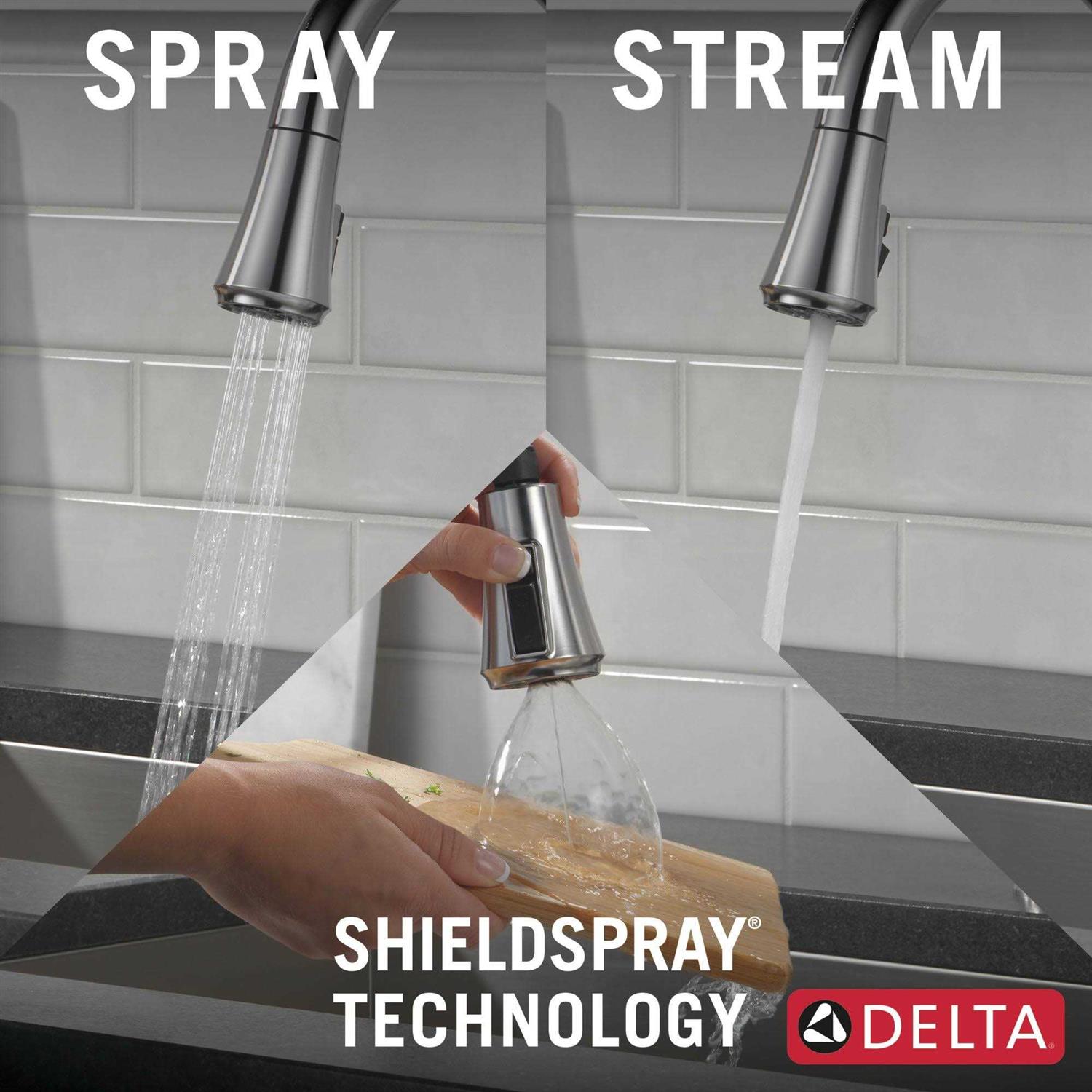 A contemporary take on traditional styling, the Coranto Kitchen Collection brings everyday refinement to a space with subtle design details that nod to both the past and the present. Delta MagnaTite Docking uses a powerful integrated magnet to set your pull down sprayer precisely into place and hold it there so it stays docked when not in use. Delta ShieldSpray Technology cleans with laser-like precision while containing mess and splatter. A concentrated jet powers away stubborn messes while an innovative shield of water contains splatter and clears off the mess, so you can spend less time soaking, scrubbing and shirt swapping. Delta kitchen faucets with DIAMOND Seal Technology perform like new for life with a patented design which reduces leak points, is less hassle to install and lasts twice as long as the industry standard. Kitchen sink faucets with Touch-Clean Spray Holes allow you to easily wipe away calcium and lime build-up with the touch of a finger.