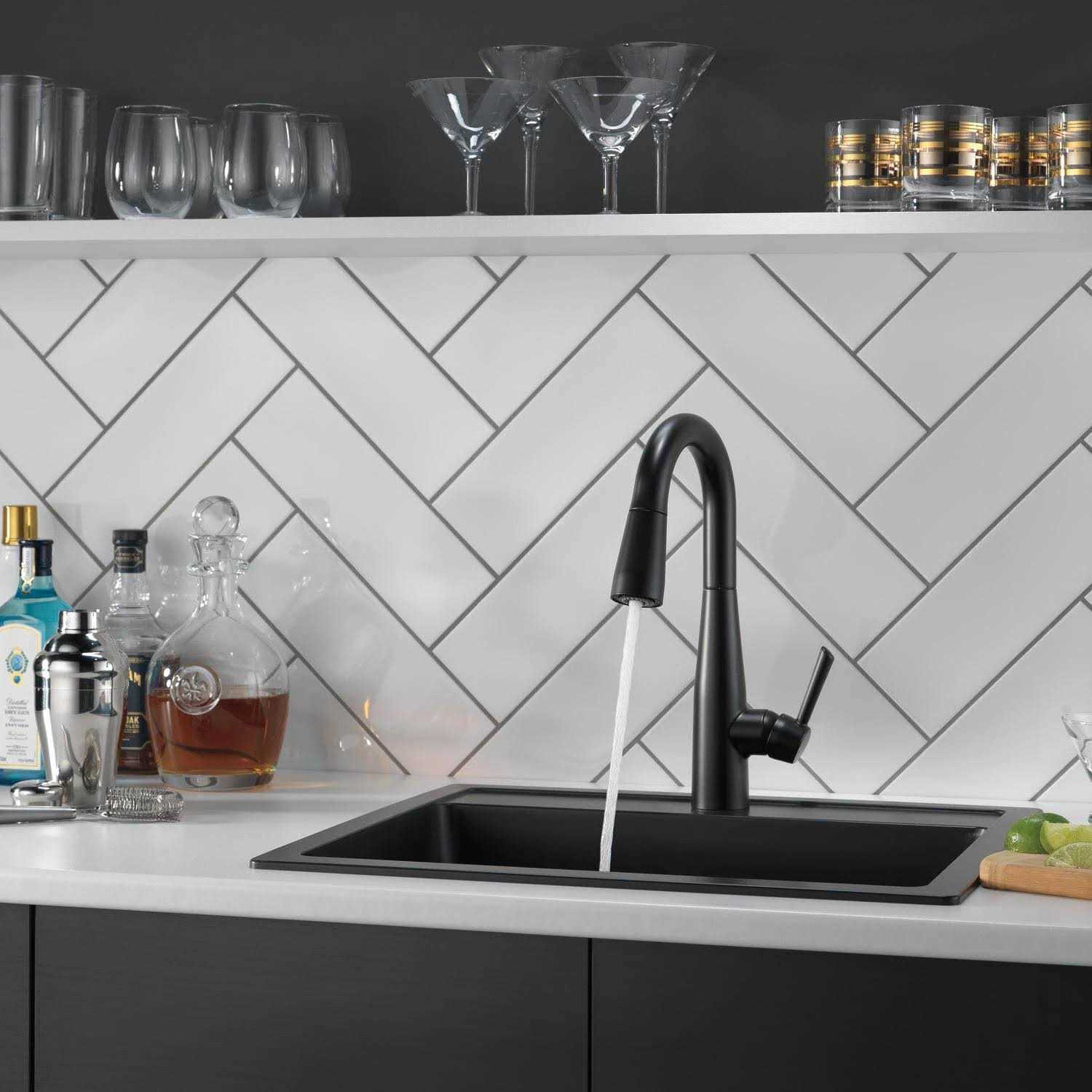 This Essa Single-Handle Bar Faucet in Matte Black with MagnaTite Docking features a soft contemporary take on a euro design with subtle detailing accents that allow the faucet to blend with contemporary and transitional design. The pull-down spray wand comes free with a gentle tug and gives you total flexibility. The hose extends and retracts without friction points, fed by gravity. As you raise the wand to dock it, the magnet embedded in the spout pulls the wand precisely into place. So, unlike other pull-downs that tend to droop over time, MagnaTite keeps your pull-down faucet looking picture-perfect. Delta’s exclusive DIAMOND Seal Technology uses a valve with a tough diamond coating. InnoFlex PEX waterways keep water inside the faucet out of contact with potential metal contaminants. This powerful combination brings you a faucet built to last up to 5 million uses. Only Delta faucets are equipped with Touch-Clean soft, rubber nubbins that allow you to easily wipe away calcium and lime build-up with the touch of a finger.