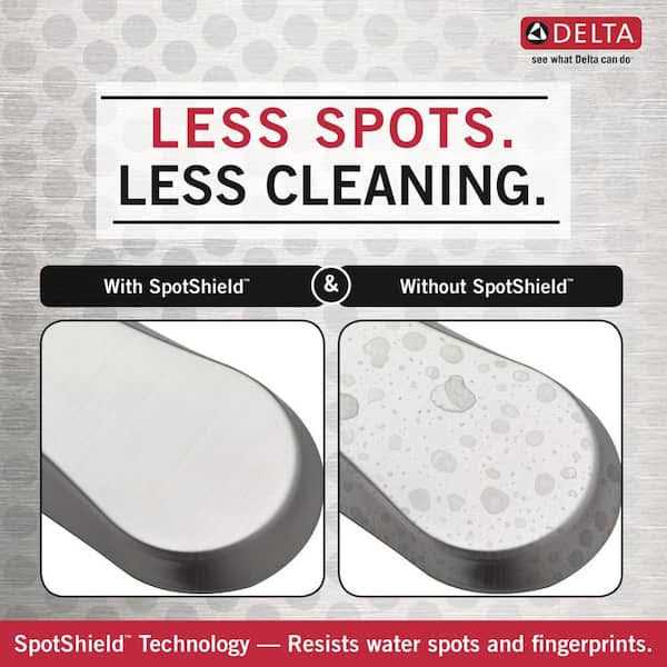 The Greydon kitchen faucet was designed with a clean, transitional shape to fit any kitchen setting and includes thoughtful innovations to enhance everyday use. Touch it on. Touch it off. Whether you have two full hands or 10 messy fingers, Delta Touch2O Technology helps keep your kitchen faucet clean, even when your hands aren’t. A simple touch anywhere on the spout or handle with your wrist or forearm activates the flow of water at the temperature where your handle is set. The Delta TempSense LED light changes color to alert you to the water’s temperature and eliminates any possible surprises or discomfort. Delta ShieldSpray Technology cleans with laser-like precision while containing mess and splatter. A concentrated jet powers away stubborn messes while an innovative shield of water contains splatter and clears off the mess, so you can spend less time soaking, scrubbing and shirt swapping.