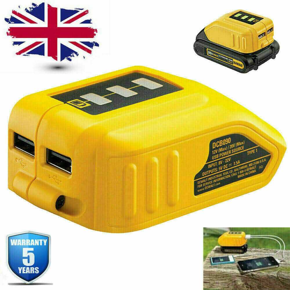 Allows you to work with all slide style battery packs Indicates when unit is powered on and ready to charge devises Similar to a fuel gauge Indicates the amount of power remaining in the battery 3 bright LED state of charge indicator DEWALT guaranteed tough for use on the jobsite or backcountry Transforms for Dewalt XR battery into a portable charger with two USB outlets to allow charging of a wide range of small electronic devices. Compatible with. It has multi-voltage compatibility with 12V 20V XR Lithium battery packs for Dewalt. USB1 output 2.1A for quick charging. USB2 output 1.0A for normal charging. Package include. 1x DCB090 USB adapter for Dewalt.