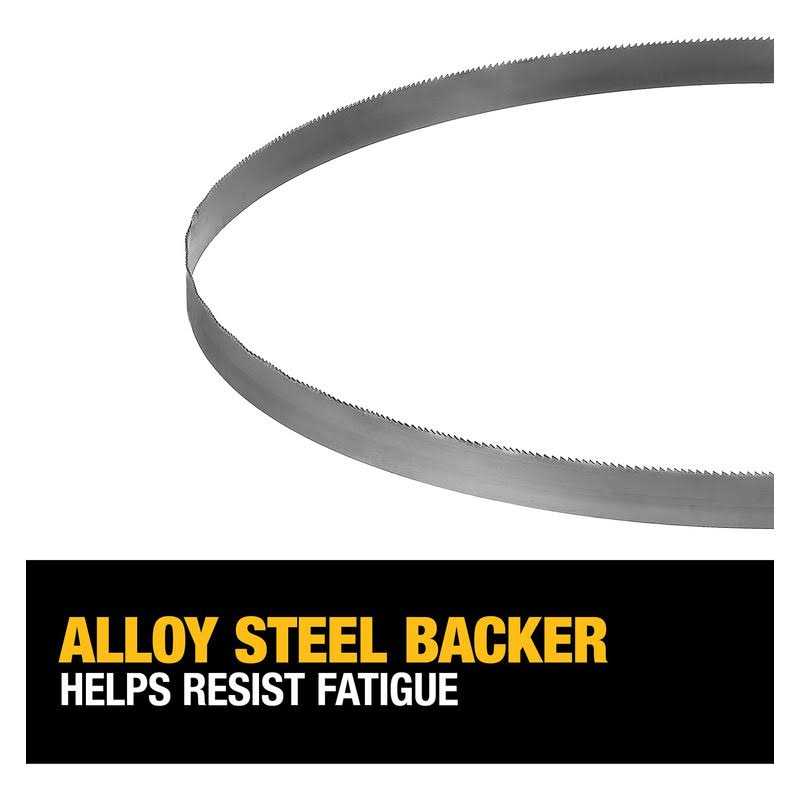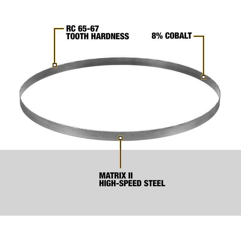 Band Saw Blades by DEWALT. Details: Crafted with 8% cobalt for extreme durability, DEWALT Bi-Metal Cordless Bandsaw Blades are ideal for thick metal, medium metal, and thin-gauge metal cutting. A Matrix II High-Speed Steel Edge delivers excellent heat and wear resistance, and Rc 65-67 tooth hardness offers helps to increased durability. An alloy steel backer provides fatigue resistance. DEWALT Bi-Metal portable bandsaw blades incorporate the Matrix II High Speed Steel Edge for heat and wear resistance. These blades have an 8% cobalt content for added durability and wear. Rc 65-67 tooth hardness also increases wear resistance. The have an alloy steel backer for fatigue resistance. Applications include thick metal, medium metal and thin gauge metal cutting.