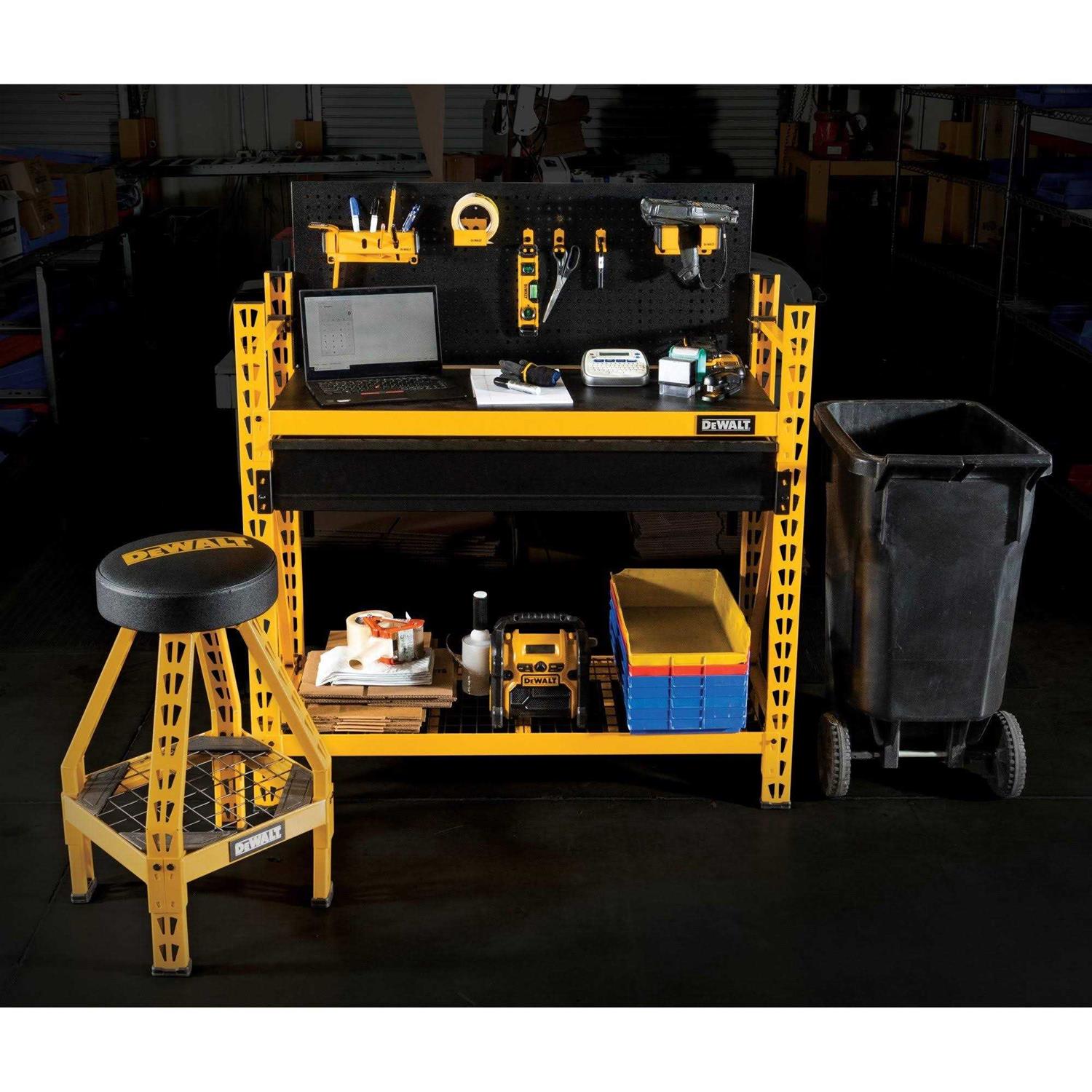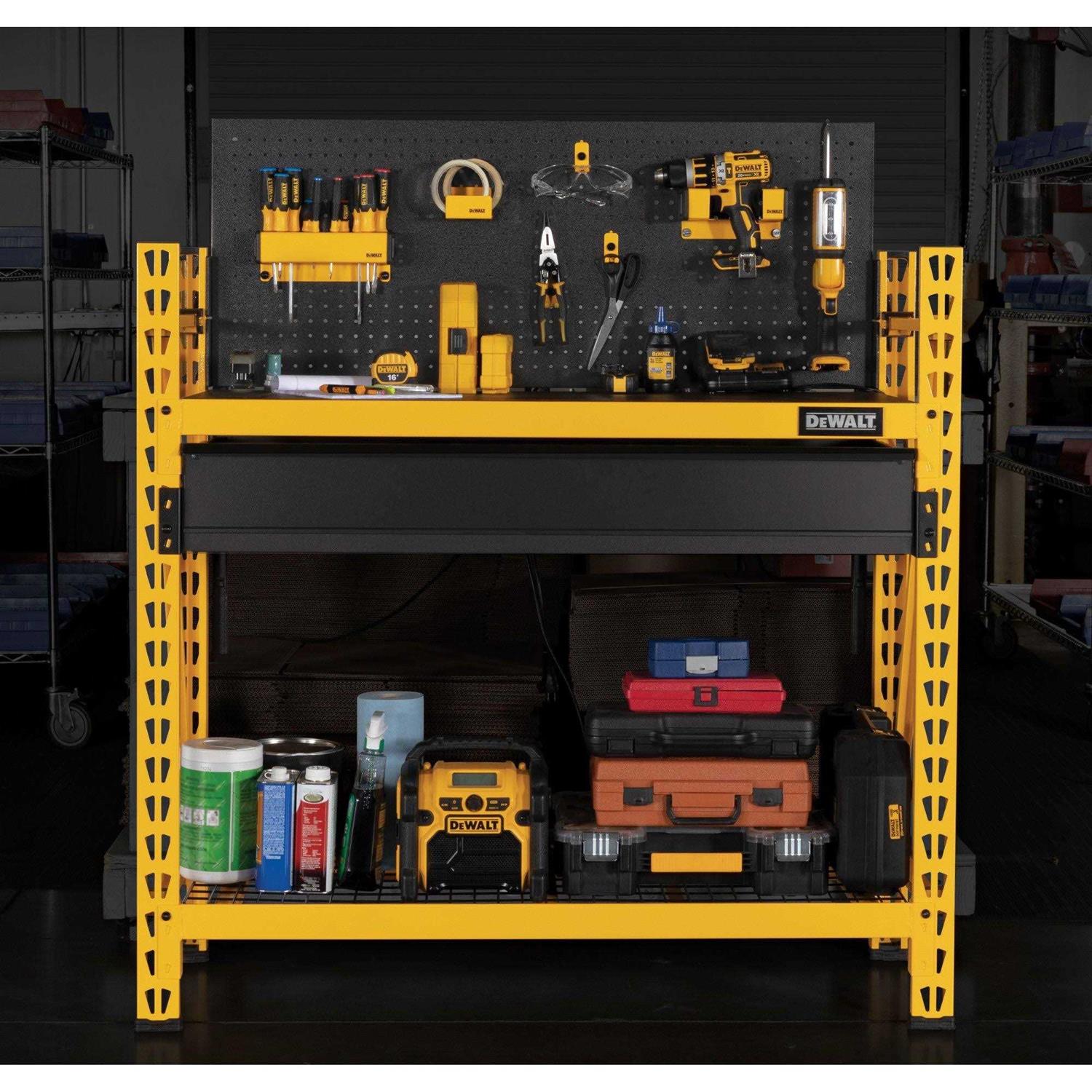 The DEWALT 2-Shelf Industrial 4-Foot Storage Rack Work Station Kit contains everything you need to create the ultimate work station and custom storage rack for garages. Featuring a durable steel frame with an industrial grade powder-coating, this kit contains both a composite and a wire grid shelf that are each rated to support up to 1,500-pounds of evenly distributed tools and equipment, for a combined capacity of 3,000-pounds. In addition to the two storage shelves, this kit includes an under-shelf storage drawer whose capacious interior is able to hold up to 120-pounds of tools and opens easily on smooth gliding ball-bearing rails. The steel pegboard panel mounts directly to the uprights and the kit includes six tool holders to help organize and store your most frequently needed tools within easy reach. Locking pins secure the shelf crossbeams and mounted accessories in place, preventing them from being easily knocked free, until they are ready to be repositioned. Glass-filled nylon feet on the uprights protect the powder coat from damage when repositioning the workstation, in addition to providing a second layer of protection against unwanted moisture and liquid spills, as a result protecting finished flooring from damage. This Dewalt work station kit makes for the ideal storage rack for garages, workshops, and more! Get your storage rack for garages today.
