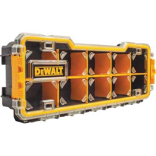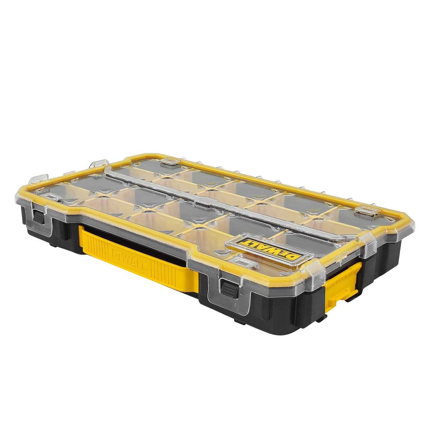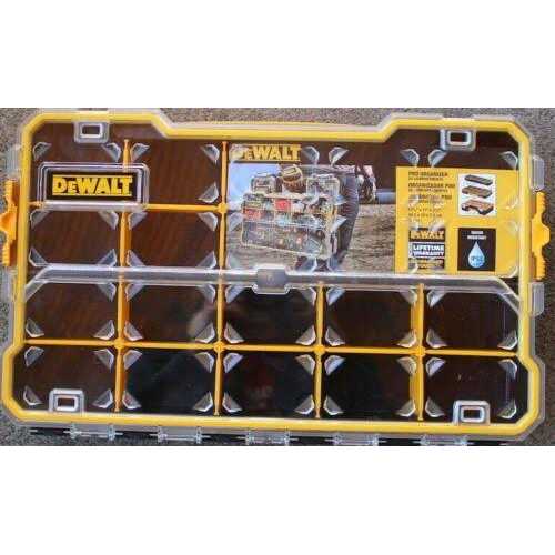 This DEWALT 20-compartment organizer with removable dividers is optimal for hand tools and small parts. It features a durable polycarbonite lid, carry handle and side latches that enable stacking it to other PRO organizers.20 compartments – Removable dividers for inner customization – Carry handle for easy portability – Heavy duty transparent Polycarbonate lid – Unique lid design keeps small parts from moving between compartments – Side latches enable stacking to other units including DWST14825 Deep PRO organizer, DWST14925 Shallow PRO Organizer and DWST14835 10 compartment PRO Organizer.SpecificationsColor: Yellow/Black – Height: 2-7/8 in (7.5 mm)Overall Length: 17-5/8 in (450 mm)Weight: 1.43 kg (3.15 lbs)Width: 11 in (28 mm).