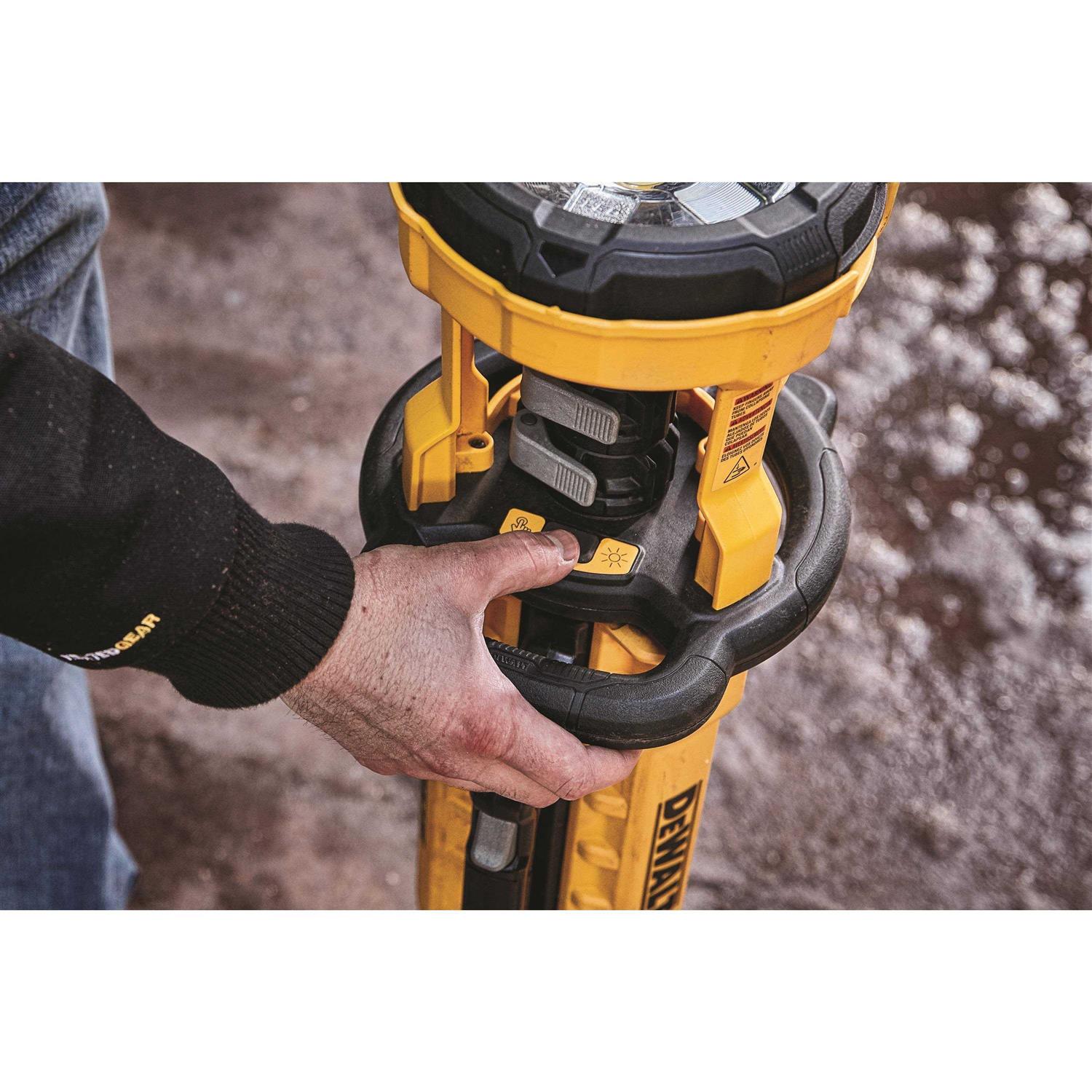 The DEWALT 20-Volt MAX Cordless Tripod Light illuminates your workspace in the toughest jobsite conditions. It’s built for incredible durability in use, storage or transport. Eliminate the hazardous heat of halogen. Cutting edge LED technology provides extended runtime and natural white light. Variable brightness settings up to 3000 Lumens let you customize illumination for your work area. Compact design with carry handle provides easy portability and it sets up in seconds. Rotating, pivoting head directs light where you need it. This package includes the light only. Natural white LED provides accurate color visibility, long life span and stays cool to the touch 3 brightness settings to customize work space illumination Telescoping pole extends light head to 7 ft. to reduce shadows and glare Latch mechanism on handle to easily extend and collapse legs Tough shroud protects light head and withstands jobsite conditions Ideal for drywall and ceiling work Ideal for painting Includes light only. Battery & Charger not included.