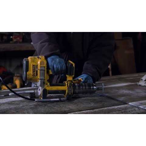 The 20V MAX* Grease Gun powers through clogged grease fittings with a motor that delivers 10,000 max PSI. This tool is ideal for high-flow applications, with the pump pushing up to 5 oz per minute. Control grease flow with the variable speed trigger and reach hard to access grease fittings with the 42 in flexible hose. Power through clogged grease fittings with a motor that delivers up to 10,000 max PSI. High-volume pump pushes up to 5.0 oz/min for high-flow applications. Control grease flow with the variable speed trigger. Reach hard to access grease fittings with the 42 in. flexible hose. Locate hard to see grease fittings in dark work areas with the bright LED. Pump filter screen prevents dirt and contamination from clogging the pump mechanism. Integrated no-mar foot design allows operators to rest the tool on flat surfaces. Air-bleeder valve assists in pump priming after cartridge changes.