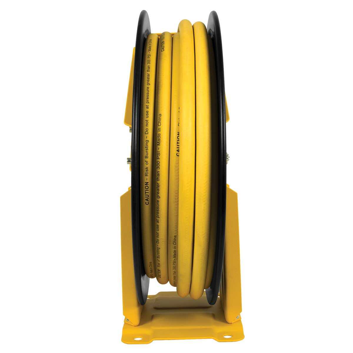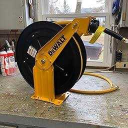 The DeWalt 3/8 x 50′ double Arm hose reel is suitable for industrial contractor or household use. The spring-powered drive feature makes hose retraction Quick automatic and easy. The 12 position ratchet gearing Lock allows for the hose to be pulled to any length. With the self-leveling system the hose can be wound up easily. The dual-arm and professional grade all-steel construction is very strong and reliable. The hose guide uses a 4-roller design to help reduce hose wear. The premium rubber air hose stays flexible to work with even at 40-degree F below Zero yet still takes the heat up to 150-degree F without swelling or bubbling. The hose is kink and oil resistant under pressure and has a 3/8 x 3′ lead in the air hose for easy compressor connection. The DeWalt 3/8 x 50′ double Arm hose reel is the perfect accessory for any air tool and any air compressor that operates at 300 PSI or less.