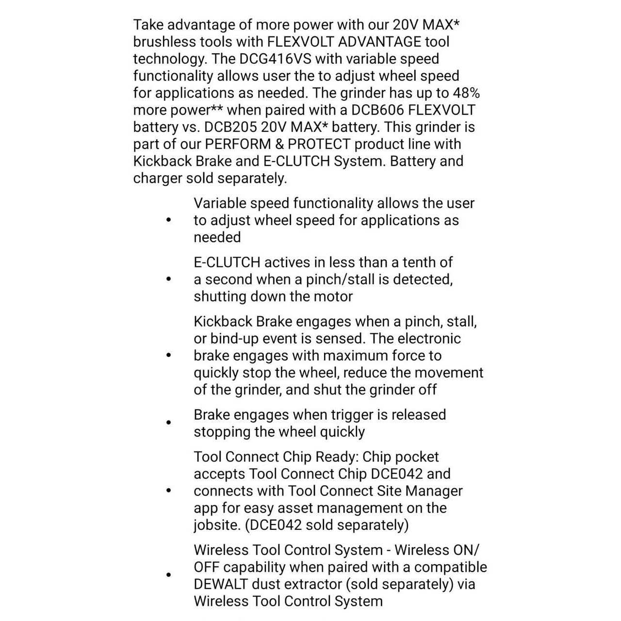 Take advantage of more power with our 20V MAX* brushless tools with FLEXVOLT ADVANTAGE tool technology. The DCG416VS with variable speed functionality allows user the to adjust wheel speed for applications as needed. The grinder has up to 48% more power** when paired with a DCB606 FLEXVOLT battery vs. This grinder is part of our PERFORM & PROTECT product line with Kickback Brake and E-CLUTCH System. Battery and charger sold separately.
