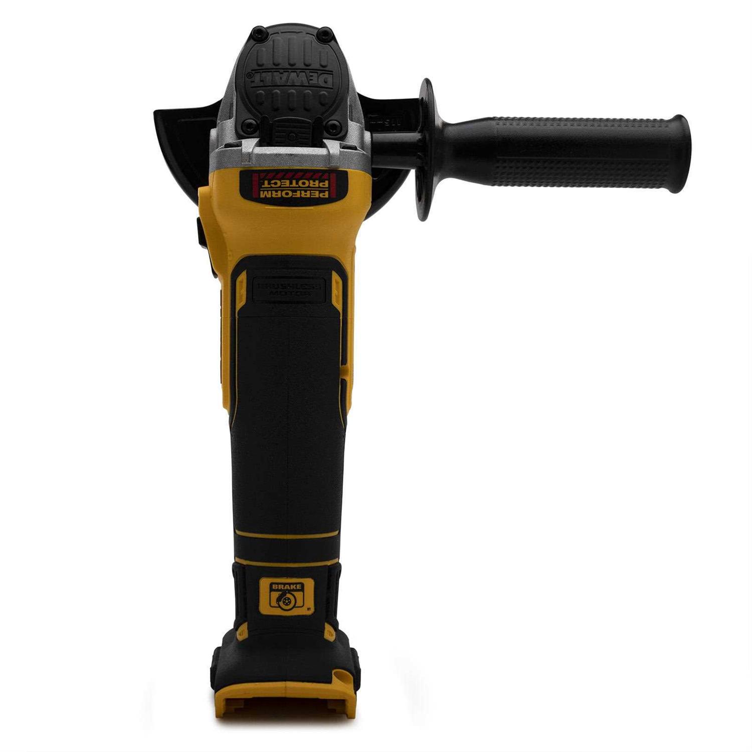 Brushless motor of the angle grinder requires no brush changes. DEWALT grinder’s brake stops wheel in 2 seconds or less on average Kickback Brake engages when a pinch, stall, or bind-up event is sensed and the electronic brake engages with maximum force to quickly stop the wheel, reduce the movement of the metal grinder and shut the grinder off. Power Loss Reset prevents accidental restarts following a power disruption when the tool is left in the “on” position.