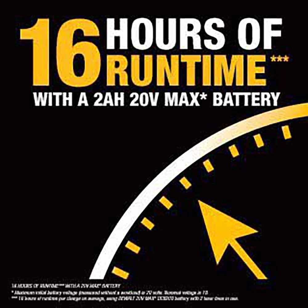 • 20V MAX* Battery Platform with 16 hour runtime on 2.0 Ah battery
