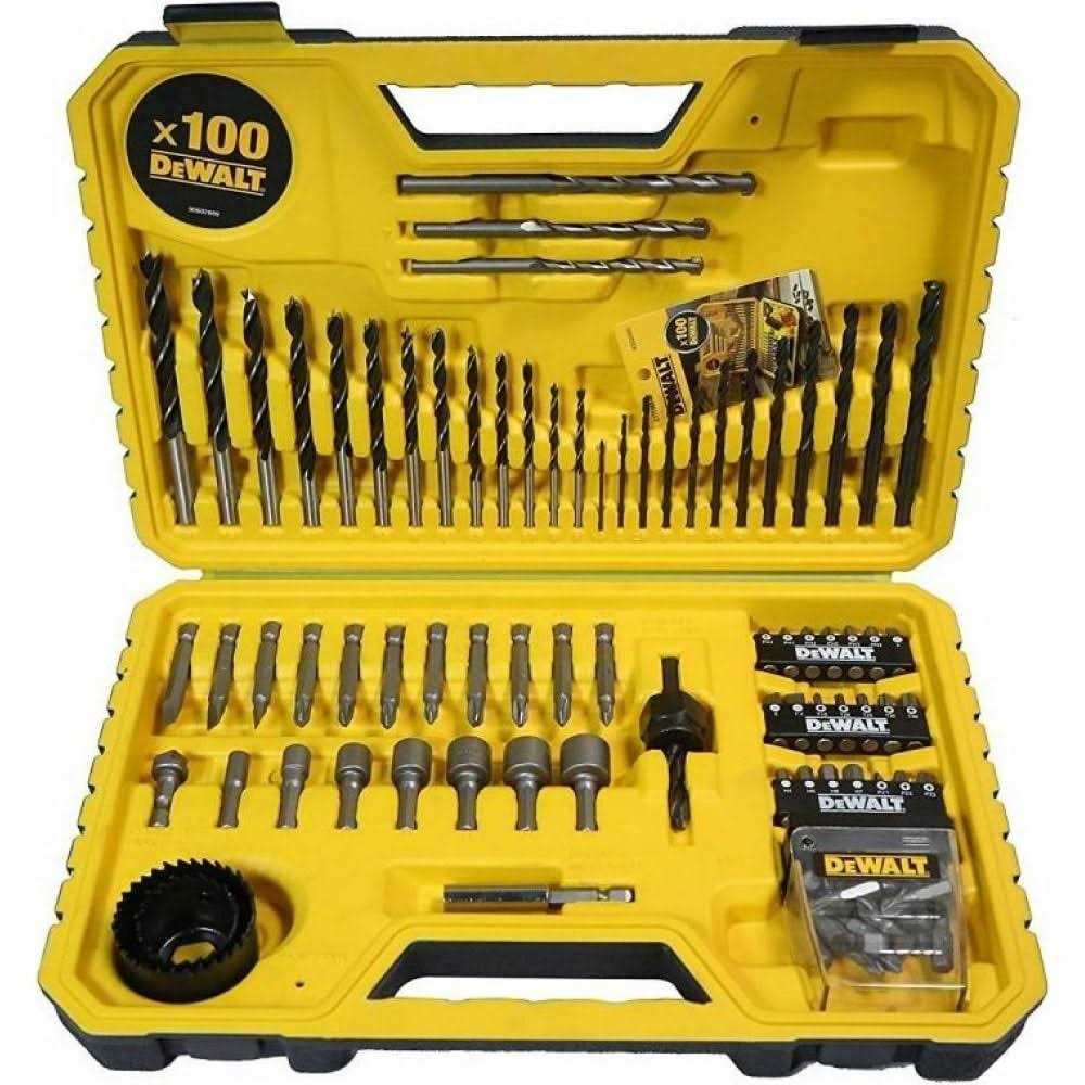 The DeWalt Drill and Drill Bit Set includes 100 accessories, such as metal drill bits, masonry drill bits, a hole saw bit, and various other bits. As such, you can tackle different jobs with one set. This set is suitable for a drill with a quick-release drill head. The brand in which professionals trust. Precision ground spiral groove for maximum drilling progress and tool life as well as excellent concentricity. Made of high-speed steel (HSS) according to DIN 338 Right-hand cutting spiral groove type N, 118 ° point angle, Tapered section. Surface bare metallic, dry. Applicable for Metal, Wood and Plastic.